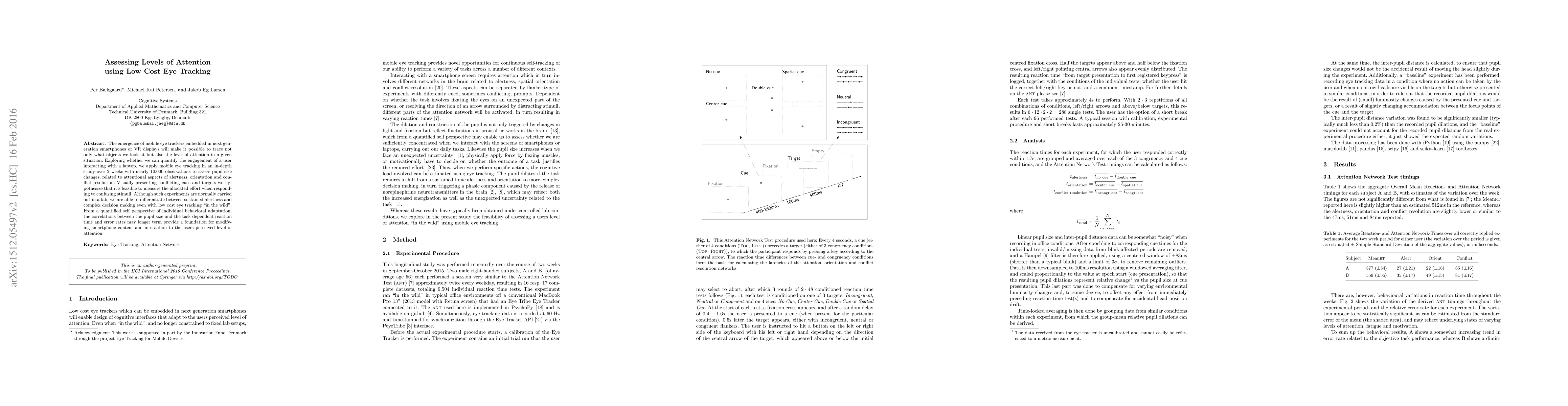 The emergence of mobile eye trackers embedded in next generation smartphones or VR displays will make it possible to trace not only what objects we look at but also the level of attention in a given situation. Exploring whether we can quantify the engagement of a user interacting with a laptop, we apply mobile eye tracking in an in-depth study over 2 weeks with nearly 10.000 observations to assess pupil size changes, related to attentional aspects of alertness, orientation and conflict resolution. Visually presenting conflicting cues and targets we hypothesize that it's feasible to measure the allocated effort when responding to confusing stimuli. Although such experiments are normally carried out in a lab, we are able to differentiate between sustained alertness and complex decision making even with low cost eye tracking "in the wild". From a quantified self perspective of individual behavioral adaptation, the correlations between the pupil size and the task dependent reaction time and error rates may longer term provide a foundation for modifying smartphone content and interaction to the users perceived level of attention.