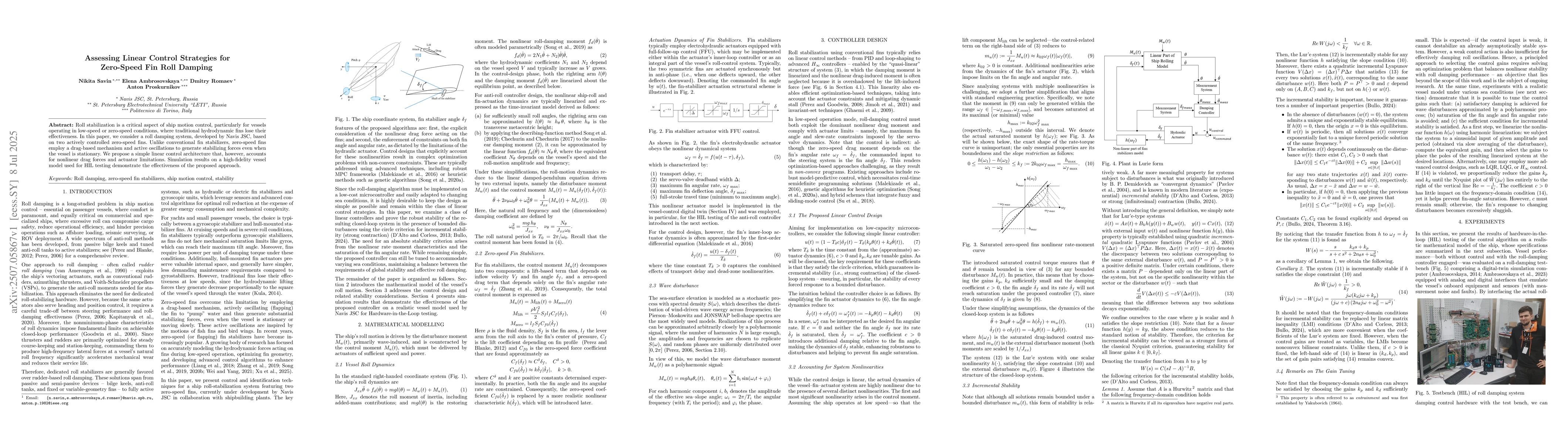 Roll stabilization is a critical aspect of ship motion control, particularly for vessels operating in low-speed or zero-speed conditions, where traditional hydrodynamic fins lose their effectiveness. In this paper, we consider a roll damping system, developed by Navis JSC, based on two actively controlled zero-speed fins. Unlike conventional fin stabilizers, zero-speed fins employ a drag-based mechanism and active oscillations to generate stabilizing forces even when the vessel is stationary. We propose a simple linear control architecture that, however, accounts for nonlinear drag forces and actuator limitations. Simulation results on a high-fidelity vessel model used for HIL testing demonstrate the effectiveness of the proposed approach.