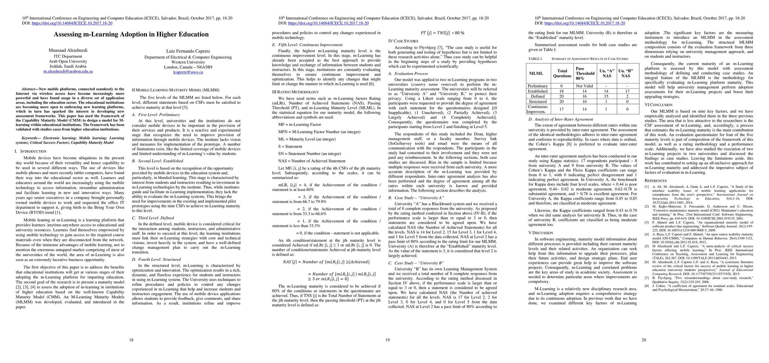 This paper develops a model for m-learning adoption in higher education using the Capability Maturity Model (CMM) framework, validated through case studies from educational institutions. The study aims to assess how new mobile platforms can enhance learning in the education sector.