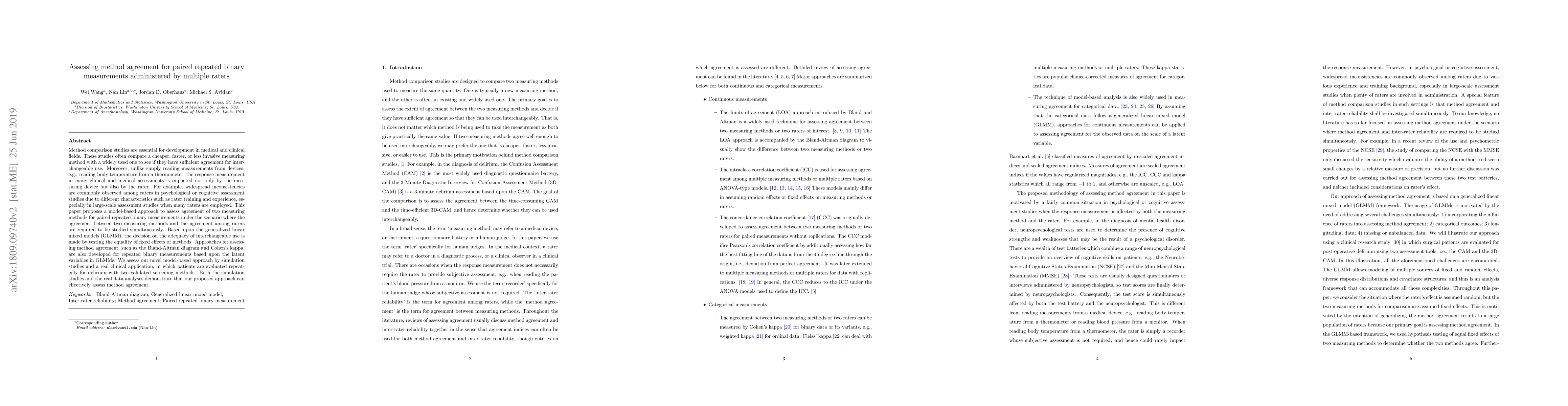 This paper proposes a model-based approach to assess method agreement for paired repeated binary measurements, using generalized linear mixed models to compare two measuring methods and their agreements among raters.