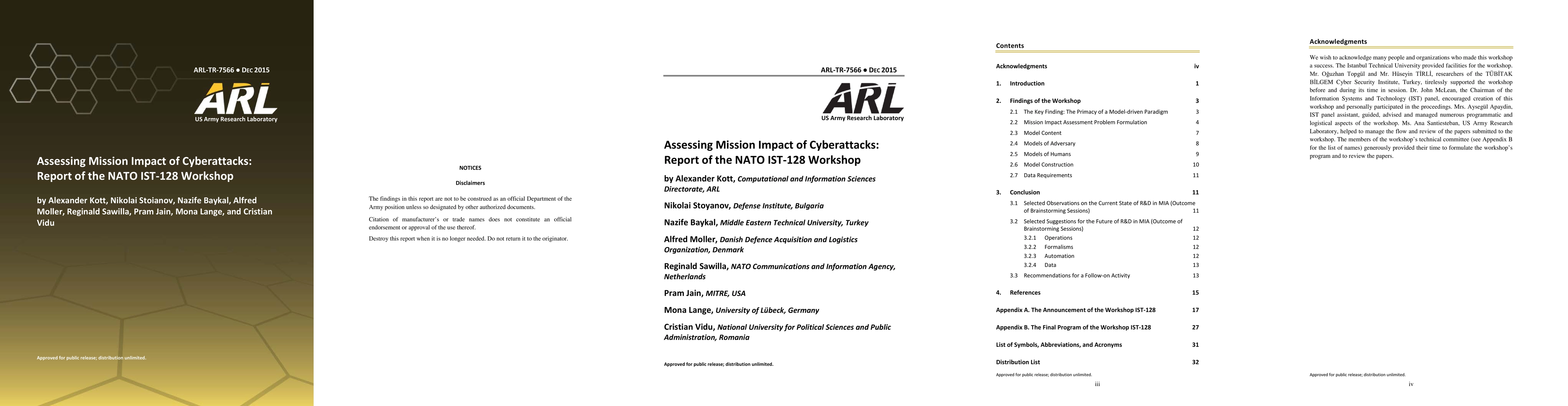 This report presents the results of a workshop conducted by the North Atlantic Treaty Organization (NATO) Information Systems Technology (IST) Panel in Istanbul, Turkey, in June 2015 to explore science and technology for characterizing the impact of cyber-attacks on missions. Military mission success is highly dependent on the communications and information systems (CISs) that support the mission and their use in the cyber battlespace. The inexorably growing dependency on computational information processing for weapons, intelligence, communication, and logistics systems continues to increase the vulnerability of missions to various cyber threats. Attacks on CISs or other cyber incidents degrade or disrupt the usage of CISs, and the resulting mission capability, performance, and completion. These incidents are expected to increase in frequency and sophistication. The workshop participants concluded that the key to solving the mission impact assessment problem was in adopting and developing a new model-driven paradigm that creates and validates mechanisms of modeling the mission organization, the mission(s), and the cyber-vulnerable systems that support the mission(s). Such models then simulate or portray the impacts of the cyber-attacks. In addition, such model-based analysis could explore multiple alternative mitigation and work-around strategies - an essential part of coping with mission impact - and select the optimal course of mitigating actions. Only such a paradigm can be expected to provide meaningful, actionable information about mission impacts that have not been seen before or do not match prior experiences and patterns. The papers presented at this workshop are available in an accompanying volume, Proceedings of the NATO Workshop IST-128, Assessing Mission Impact of Cyber Attacks.
