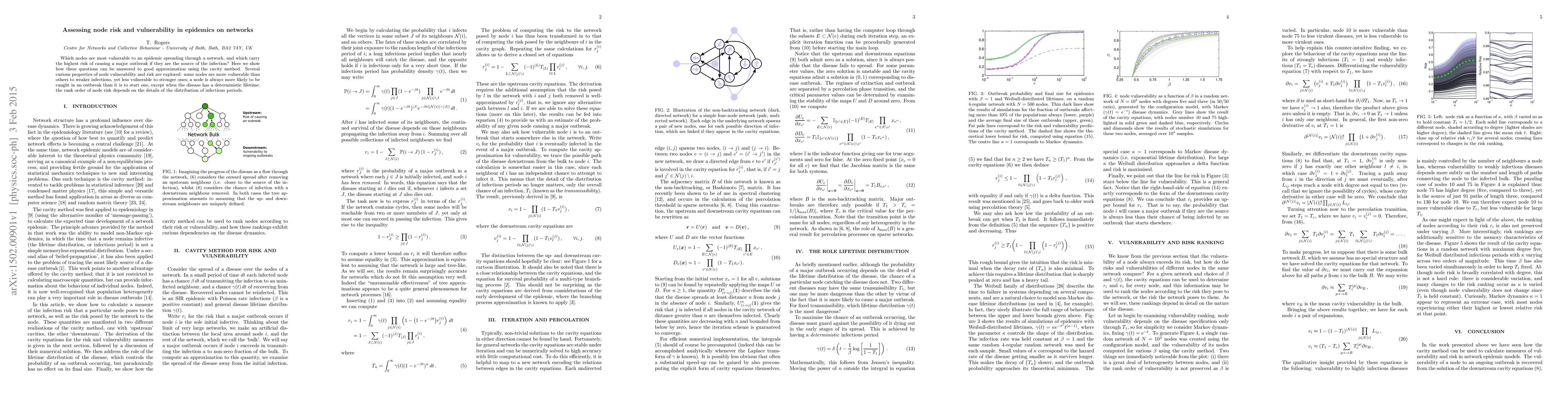 Which nodes are most vulnerable to an epidemic spreading through a network, and which carry the highest risk of causing a major outbreak if they are the source of the infection? Here we show how these questions can be answered to good approximation using the cavity method. Several curious properties of node vulnerability and risk are explored: some nodes are more vulnerable than others to weaker infections, yet less vulnerable to stronger ones; a node is always more likely to be caught in an outbreak than it is to start one, except when the disease has a deterministic lifetime; the rank order of node risk depends on the details of the distribution of infectious periods.