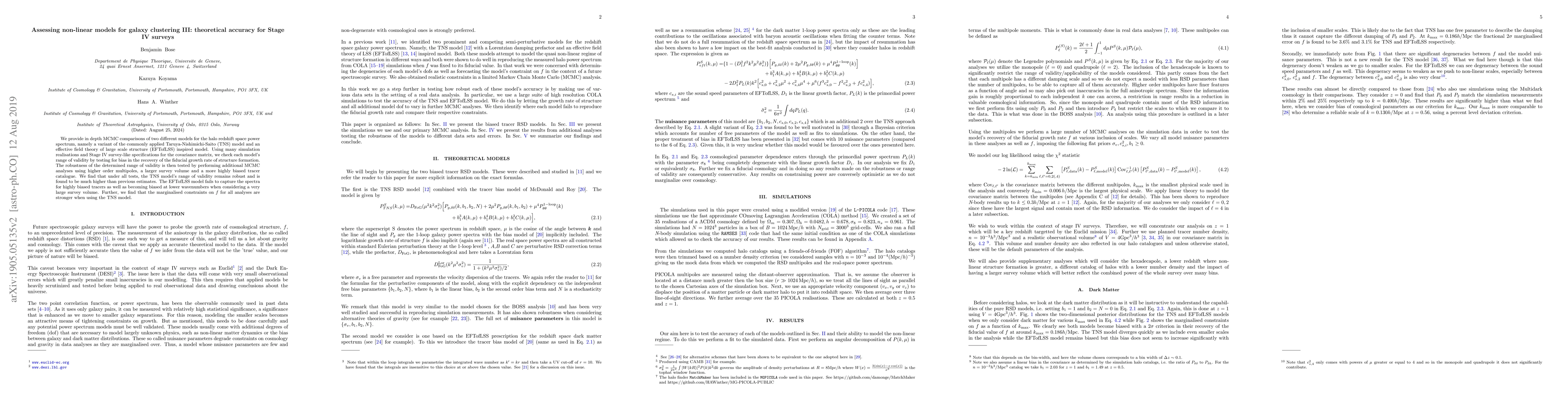 Two galaxy clustering models were compared in a Stage IV survey simulation study, finding that the Taruya-Nishimichi-Saito model is more accurate and robust than an effective field theory of large scale structure model.