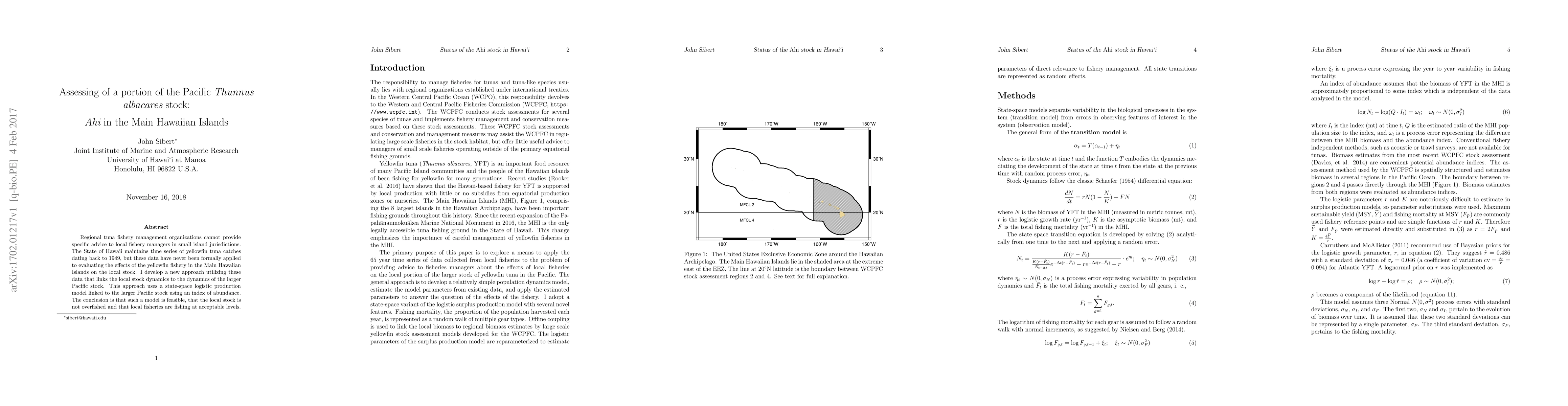 This paper develops a new state-space logistic production model to evaluate the yellowfin tuna fishery's impact in the Main Hawaiian Islands, linking local stock dynamics to the larger Pacific stock. The study concludes that the local stock is not overfished and fisheries are operating at acceptable levels.