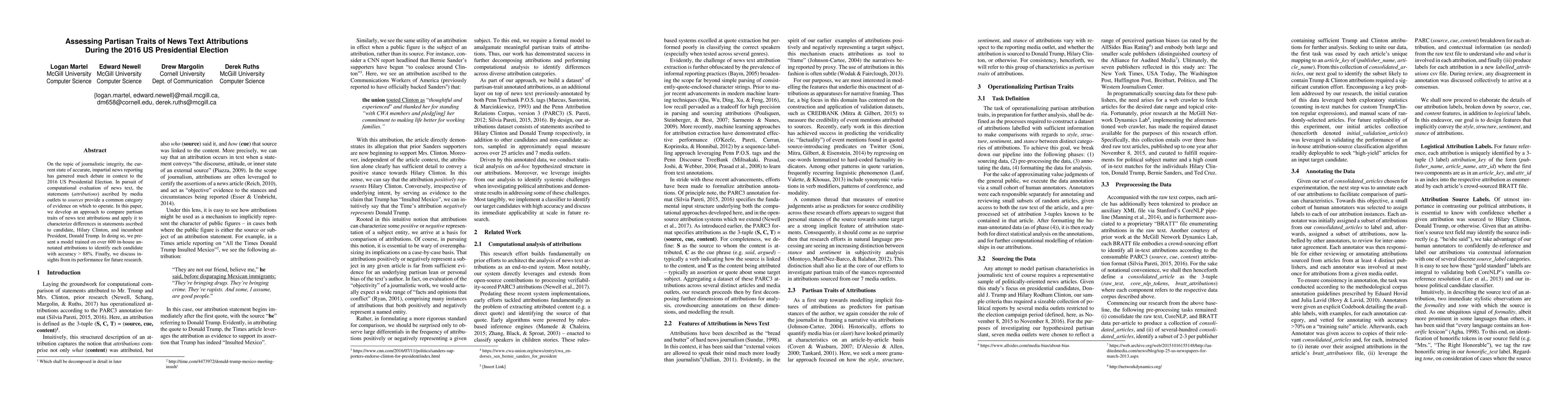 On the topic of journalistic integrity, the current state of accurate, impartial news reporting has garnered much debate in context to the 2016 US Presidential Election. In pursuit of computational evaluation of news text, the statements (attributions) ascribed by media outlets to sources provide a common category of evidence on which to operate. In this paper, we develop an approach to compare partisan traits of news text attributions and apply it to characterize differences in statements ascribed to candidate, Hilary Clinton, and incumbent President, Donald Trump. In doing so, we present a model trained on over 600 in-house annotated attributions to identify each candidate with accuracy > 88%. Finally, we discuss insights from its performance for future research.