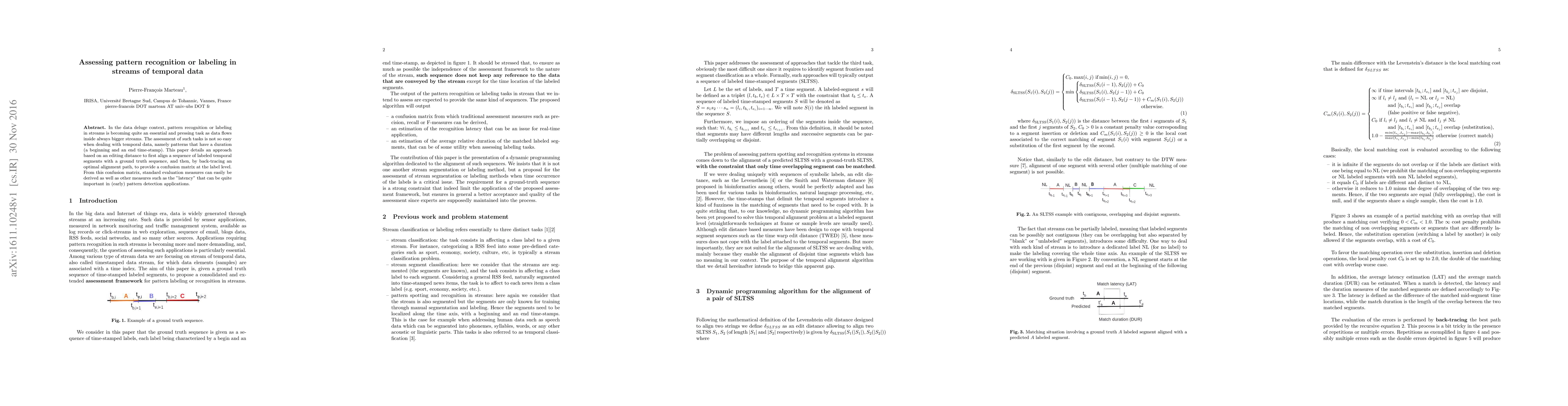 In the data deluge context, pattern recognition or labeling in streams is becoming quite an essential and pressing task as data flows inside always bigger streams. The assessment of such tasks is not so easy when dealing with temporal data, namely patterns that have a duration (a beginning and an end time-stamp). This paper details an approach based on an editing distance to first align a sequence of labeled temporal segments with a ground truth sequence, and then, by back-tracing an optimal alignment path, to provide a confusion matrix at the label level. From this confusion matrix, standard evaluation measures can easily be derived as well as other measures such as the "latency" that can be quite important in (early) pattern detection applications.