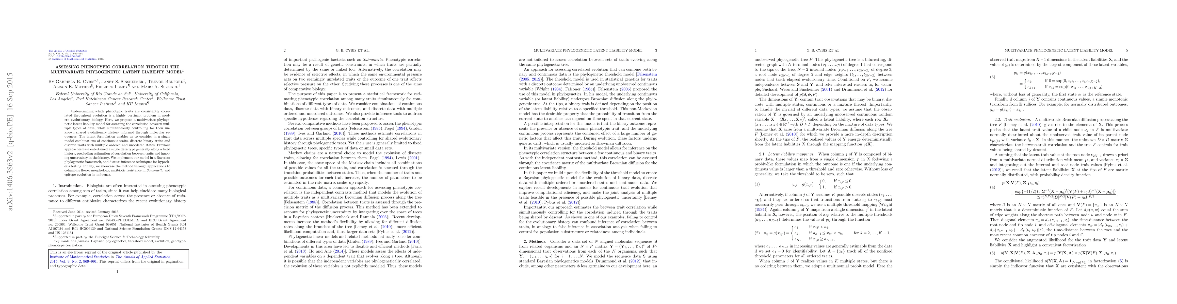 Understanding which phenotypic traits are consistently correlated throughout evolution is a highly pertinent problem in modern evolutionary biology. Here, we propose a multivariate phylogenetic latent liability model for assessing the correlation between multiple types of data, while simultaneously controlling for their unknown shared evolutionary history informed through molecular sequences. The latent formulation enables us to consider in a single model combinations of continuous traits, discrete binary traits and discrete traits with multiple ordered and unordered states. Previous approaches have entertained a single data type generally along a fixed history, precluding estimation of correlation between traits and ignoring uncertainty in the history. We implement our model in a Bayesian phylogenetic framework, and discuss inference techniques for hypothesis testing. Finally, we showcase the method through applications to columbine flower morphology, antibiotic resistance in Salmonella and epitope evolution in influenza.