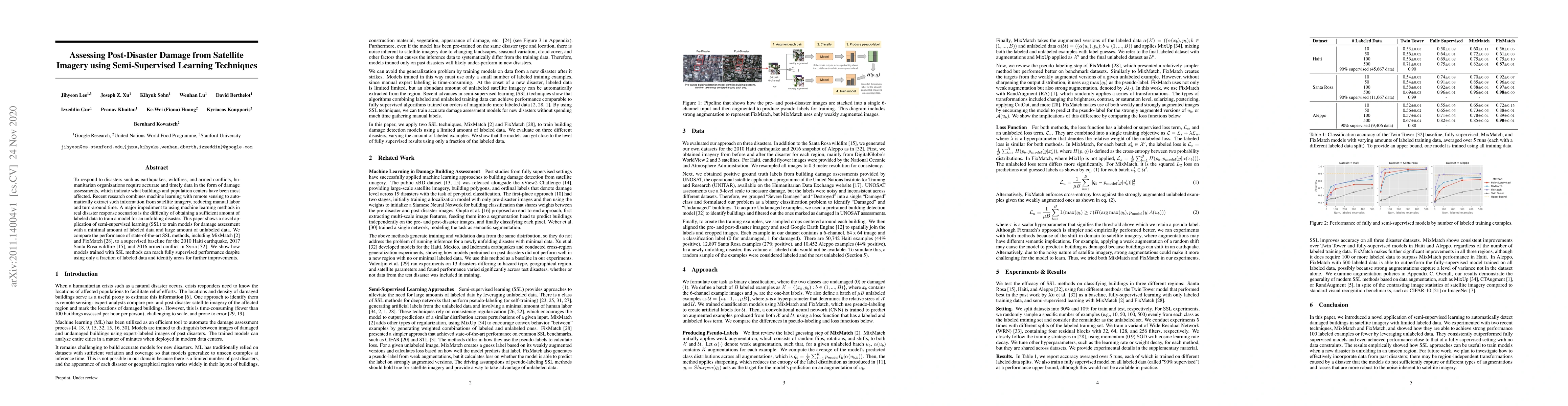 Researchers used semi-supervised learning techniques to analyze satellite imagery for post-disaster damage assessments, achieving performance similar to supervised methods with minimal labeled data.