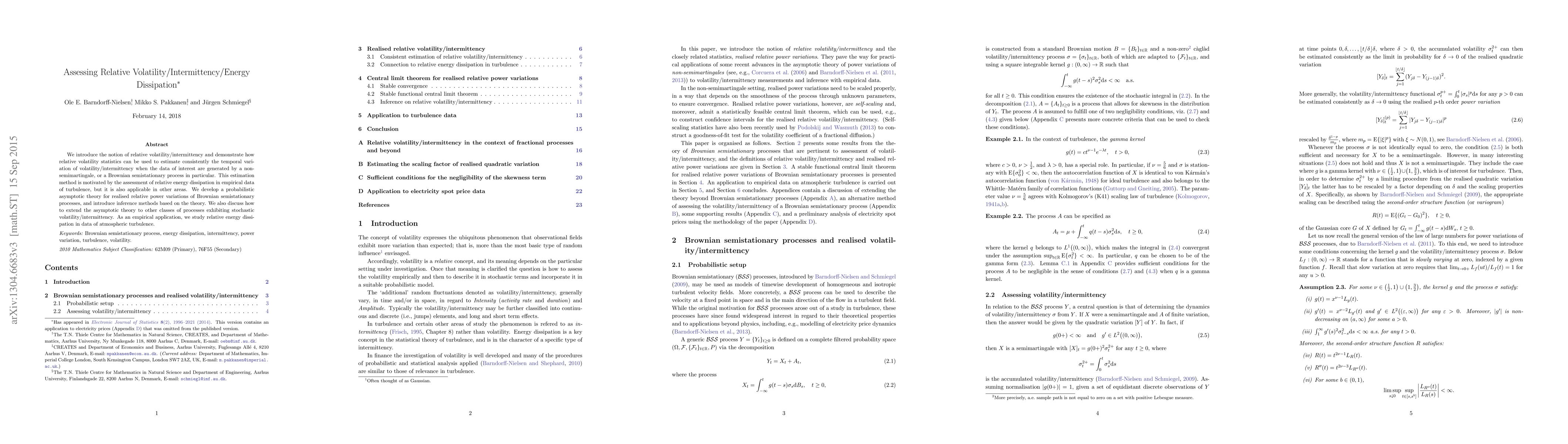 This paper introduces relative volatility/intermittency statistics to estimate temporal variations in non-semimartingale processes, such as Brownian semistationary processes, and applies it to assess relative energy dissipation in turbulence data. It develops a probabilistic asymptotic theory and inference methods for these processes.