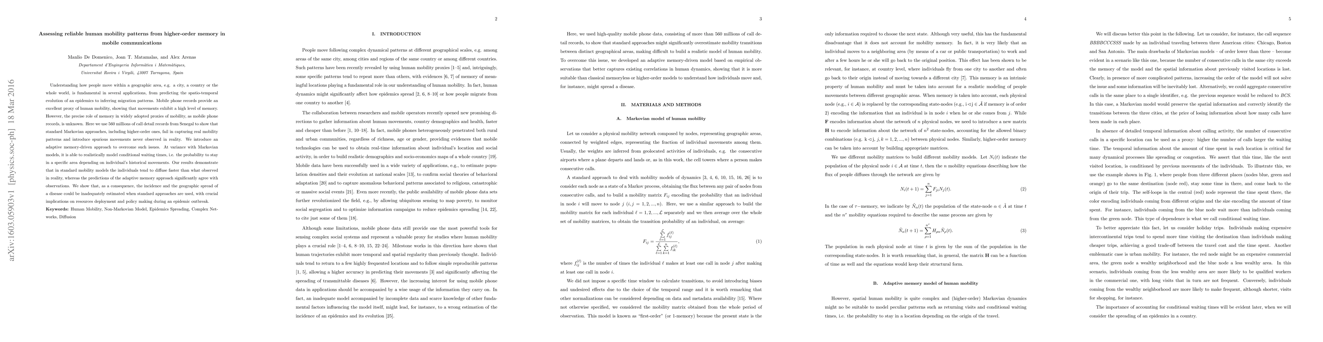 Understanding how people move within a geographic area, e.g. a city, a country or the whole world, is fundamental in several applications, from predicting the spatio-temporal evolution of an epidemics to inferring migration patterns. Mobile phone records provide an excellent proxy of human mobility, showing that movements exhibit a high level of memory. However, the precise role of memory in widely adopted proxies of mobility, as mobile phone records, is unknown. Here we use 560 millions of call detail records from Senegal to show that standard Markovian approaches, including higher-order ones, fail in capturing real mobility patterns and introduce spurious movements never observed in reality. We introduce an adaptive memory-driven approach to overcome such issues. At variance with Markovian models, it is able to realistically model conditional waiting times, i.e. the probability to stay in a specific area depending on individual's historical movements. Our results demonstrate that in standard mobility models the individuals tend to diffuse faster than what observed in reality, whereas the predictions of the adaptive memory approach significantly agree with observations. We show that, as a consequence, the incidence and the geographic spread of a disease could be inadequately estimated when standard approaches are used, with crucial implications on resources deployment and policy making during an epidemic outbreak.