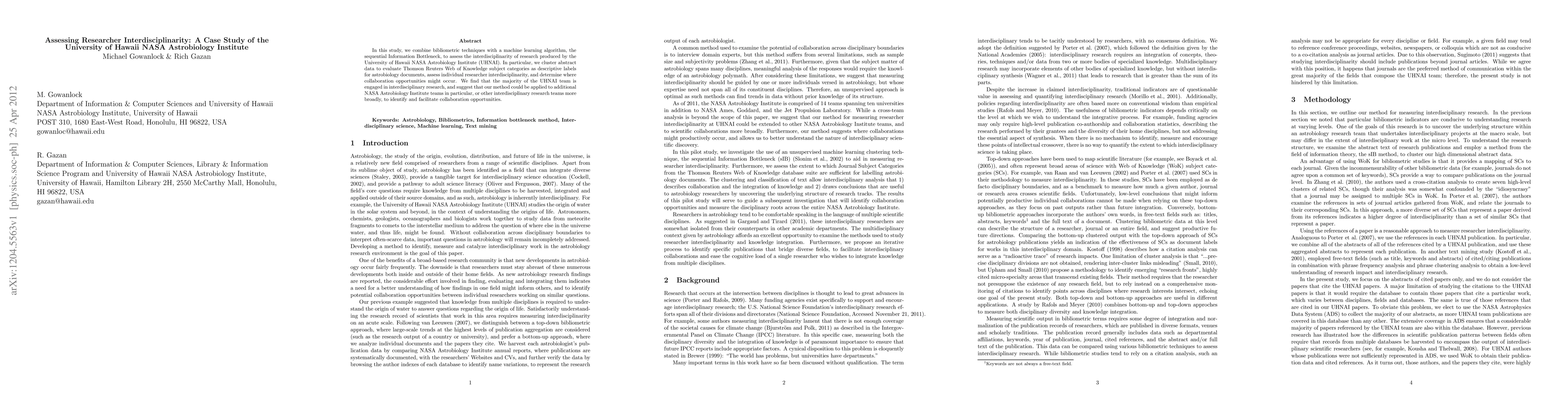In this study, we combine bibliometric techniques with a machine learning algorithm, the sequential Information Bottleneck, to assess the interdisciplinarity of research produced by the University of Hawaii NASA Astrobiology Institute (UHNAI). In particular, we cluster abstract data to evaluate Thomson Reuters Web of Knowledge subject categories as descriptive labels for astrobiology documents, assess individual researcher interdisciplinarity, and determine where collaboration opportunities might occur. We find that the majority of the UHNAI team is engaged in interdisciplinary research, and suggest that our method could be applied to additional NASA Astrobiology Institute teams in particular, or other interdisciplinary research teams more broadly, to identify and facilitate collaboration opportunities.