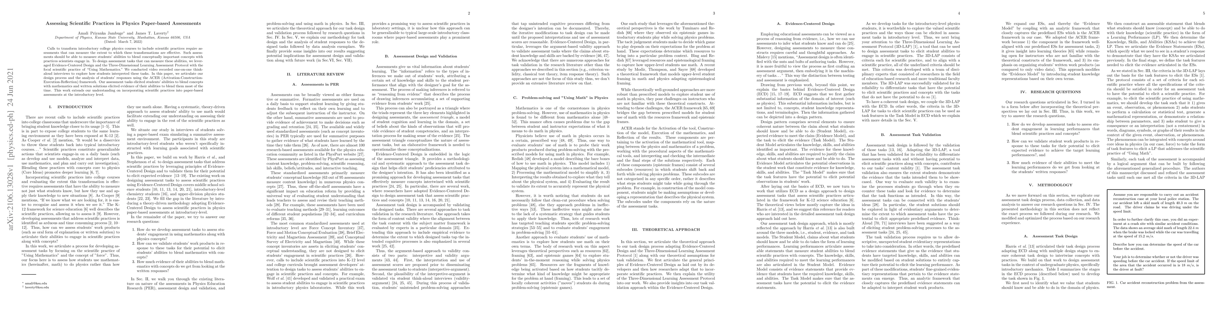 Calls to transform introductory college physics courses to include scientific practices require assessments that can measure the extent to which these transformations are effective. Such assessments should be able to measure students' abilities to blend conceptually important concepts with practices scientists engage in. To design assessment tasks that can measure these abilities, we leveraged Evidence-Centered Design and the Three-Dimensional Learning Assessment Protocol with the focal scientific practice of "Using Mathematics." We conducted video recorded one-on-one think-aloud interviews to explore how students interpreted these tasks. In this paper, we articulate our design process and the analysis of students' responses using the ACER (Activation-Construction-Execution-Reflection) framework. Our assessment tasks elicited students' abilities to blend concepts with mathematics and written solutions elicited evidence of their abilities to blend them most of the time. This work extends our understanding on incorporating scientific practices into paper-based assessments at the introductory level.