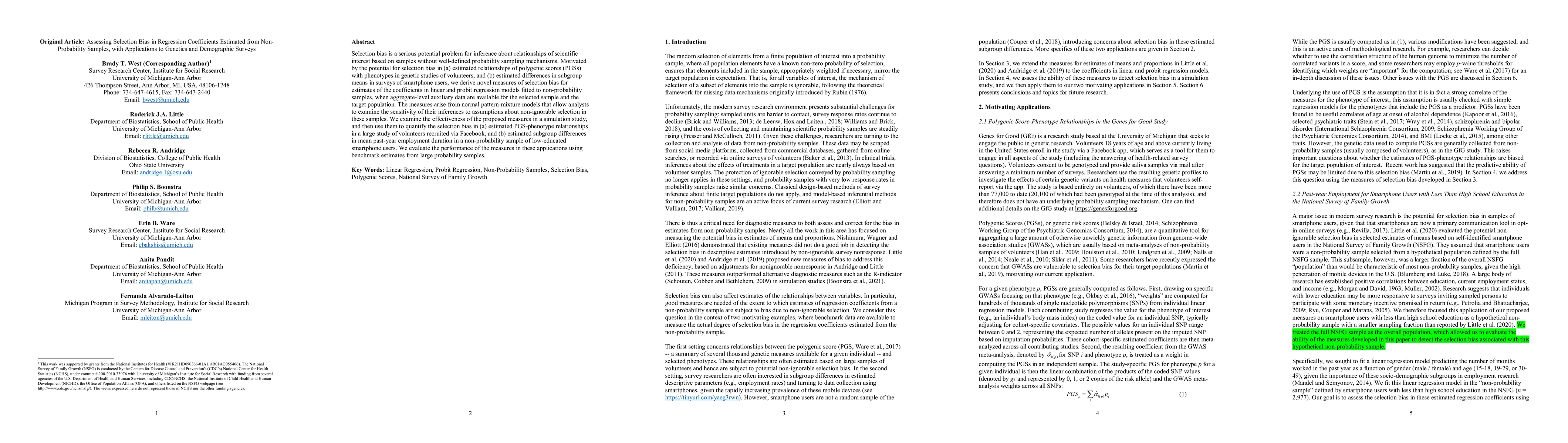 This paper develops new measures to assess selection bias in regression coefficients from non-probability samples, applying these measures to genetic studies and demographic surveys. The effectiveness of the measures is evaluated through simulations and real-world applications, comparing results against benchmarks from probability samples.