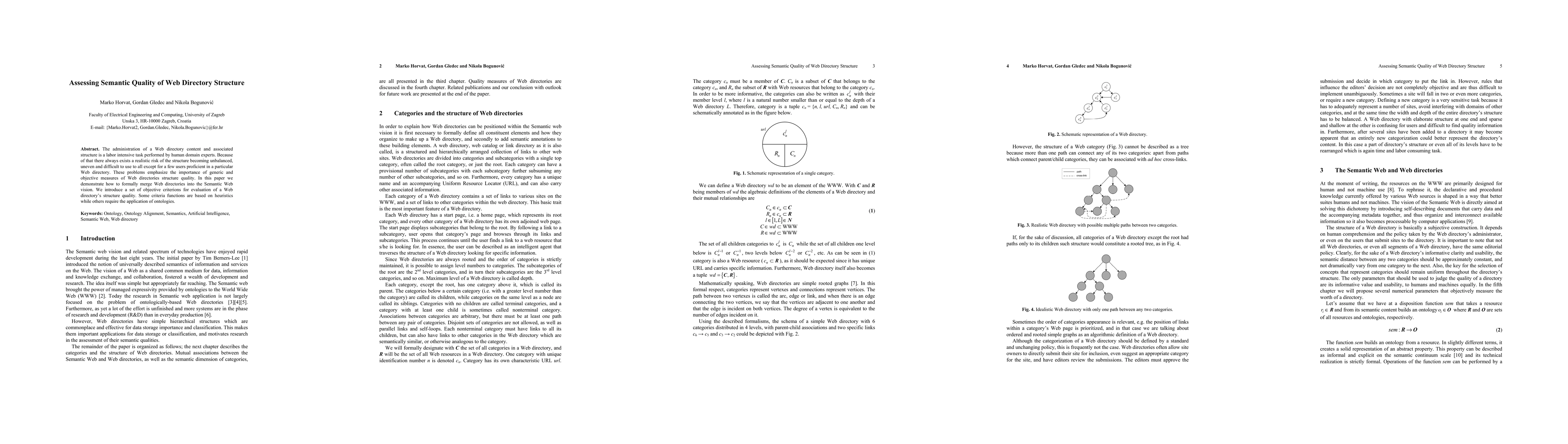 This paper proposes objective measures to assess the quality of web directory structures, emphasizing the integration of these directories into the Semantic Web. It introduces criteria for evaluating directory quality, combining heuristics and ontology-based approaches to address the inherent challenges of human-managed directory content.