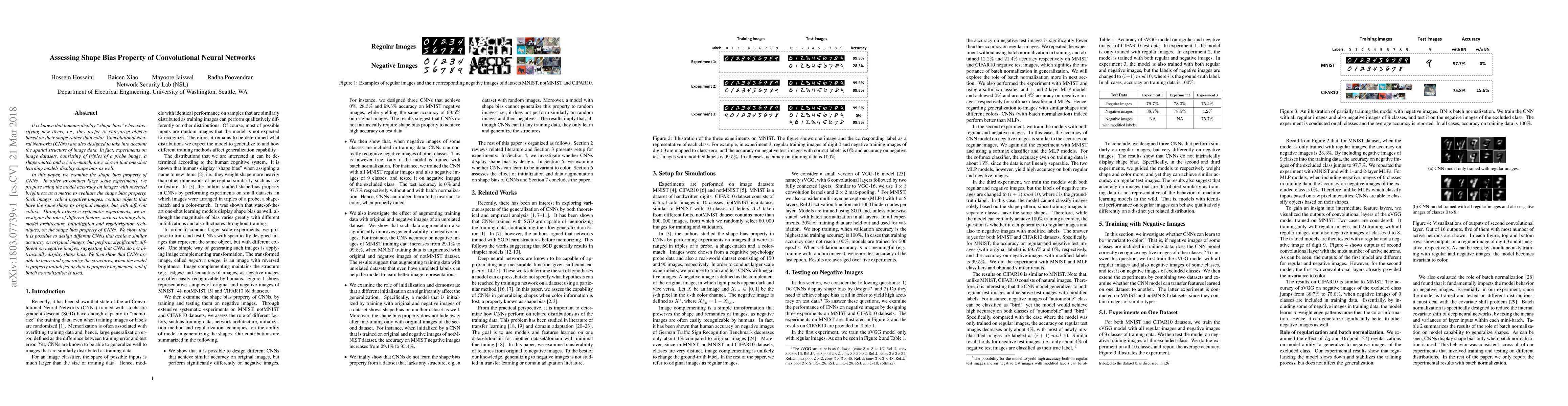 This paper investigates the shape bias property in Convolutional Neural Networks (CNNs) by examining their performance on images with reversed brightness, termed negative images. The study finds that CNNs do not inherently display shape bias but can learn it through proper initialization, data augmentation, and the use of batch normalization.