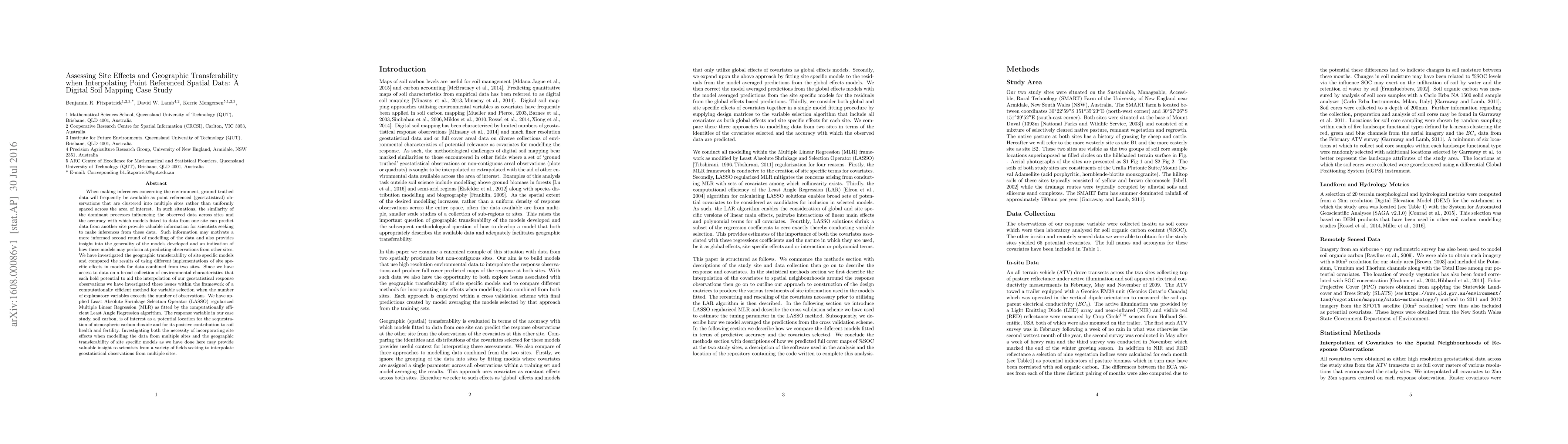 When making inferences concerning the environment, ground truthed data will frequently be available as point referenced (geostatistical) observations that are clustered into multiple sites rather than uniformly spaced across the area of interest. In such situations, the similarity of the dominant processes influencing the observed data across sites and the accuracy with which models fitted to data from one site can predict data from another site provide valuable information for scientists seeking to make inferences from these data. Such information may motivate a more informed second round of modelling of the data and also provides insight into the generality of the models developed and an indication of how these models may perform at predicting observations from other sites. We have investigated the geographic transferability of site specific models and compared the results of using different implementations of site specific effects in models for data combined from two sites. Since we have access to data on a broad collection of environmental characteristics that each held potential to aid the interpolation of our geostatistical response observations we have investigated these issues within the framework of a computationally efficient method for variable selection when the number of explanatory variables exceeds the number of observations. We have applied Least Absolute Shrinkage Selection Operator (LASSO) regularized Multiple Linear Regression (MLR) as fitted by the computationally efficient Least Angle Regression algorithm. The response variable in our case study, soil carbon, is of interest as a potential location for the sequestration of atmospheric carbon dioxide and for its positive contribution to soil health and fertility.