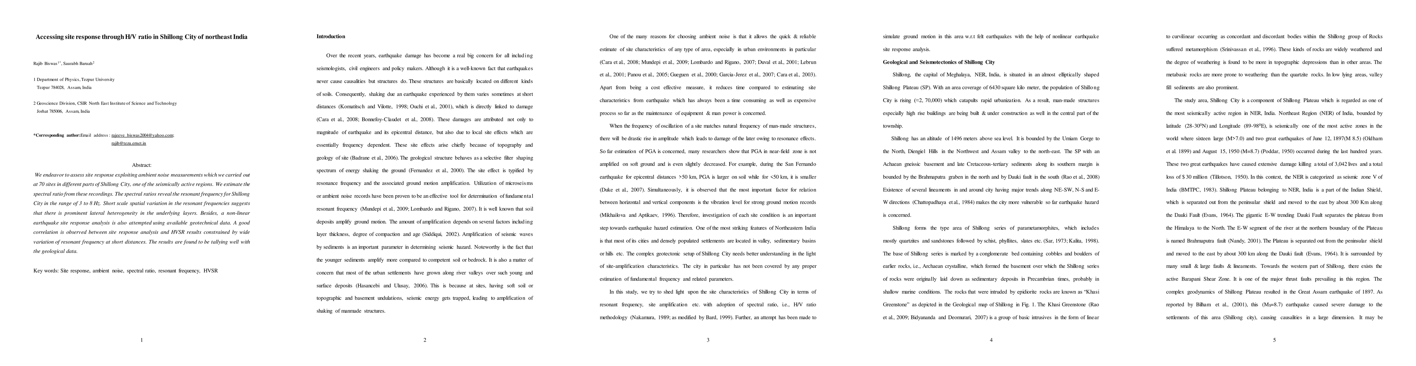 This study investigates site response in Shillong City, northeast India, using ambient noise measurements at 70 sites. The H/V ratio analysis reveals resonant frequencies between 3 to 8 Hz, indicating significant lateral heterogeneity in subsurface layers, corroborated by geotechnical data and geological information.