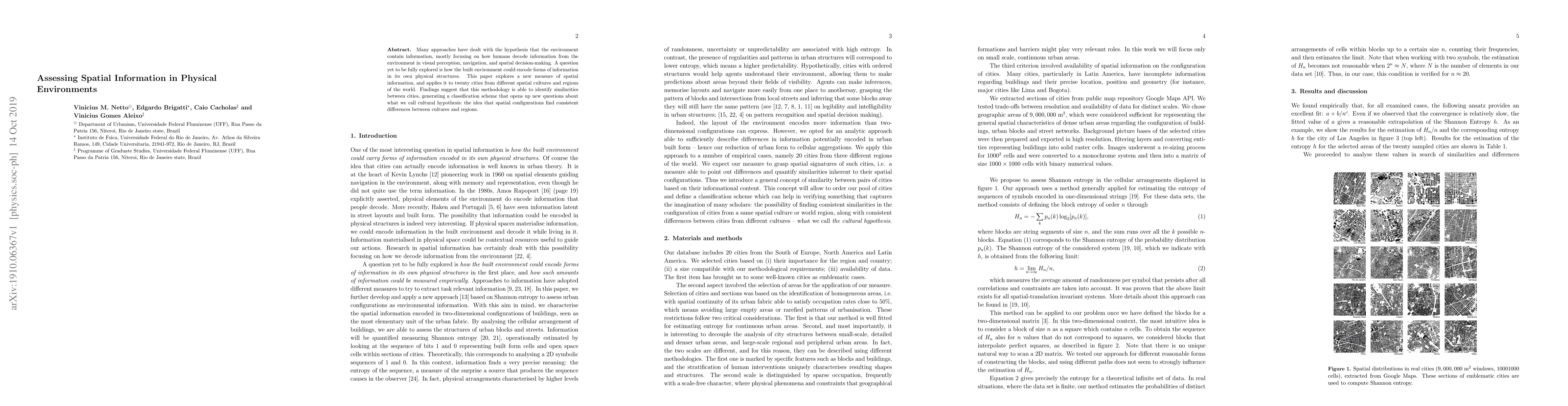 Many approaches have dealt with the hypothesis that the environment contain information, mostly focusing on how humans decode information from the environment in visual perception, navigation, and spatial decision-making. A question yet to be fully explored is how the built environment could encode forms of information in its own physical structures. This paper explores a new measure of spatial information, and applies it to twenty cities from different spatial cultures and regions of the world. Findings suggest that this methodology is able to identify similarities between cities, generating a classification scheme that opens up new questions about what we call "cultural hypothesis": the idea that spatial configurations find consistent differences between cultures and regions.