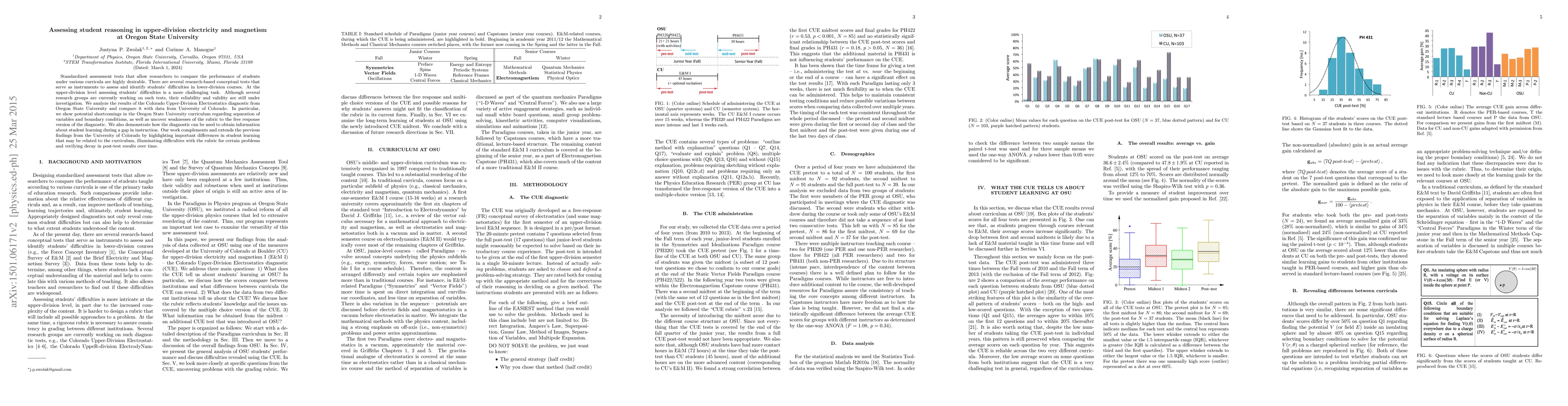 Standardized assessment tests that allow researchers to compare the performance of students under various curricula are highly desirable. There are several research-based conceptual tests that serve as instruments to assess and identify students' difficulties in lower-division courses. At the upper-division level, however, assessing students' difficulties is a more challenging task. Although several research groups are currently working on such tests, their reliability and validity are still under investigation. We analyze the results of the Colorado Upper-Division Electrostatics diagnostic from Oregon State University and compare it with data from University of Colorado. In particular, we show potential shortcomings in the Oregon State University curriculum regarding separation of variables and boundary conditions, as well as uncover weaknesses of the rubric to the free response version of the diagnostic. We also demonstrate that the diagnostic can be used to obtain information about student learning during a gap in instruction. Our work complements and extends the previous findings from the University of Colorado by highlighting important differences in student learning that may be related to the curriculum, illuminating difficulties with the rubric for certain problems and verifying decay in post-test results over time.