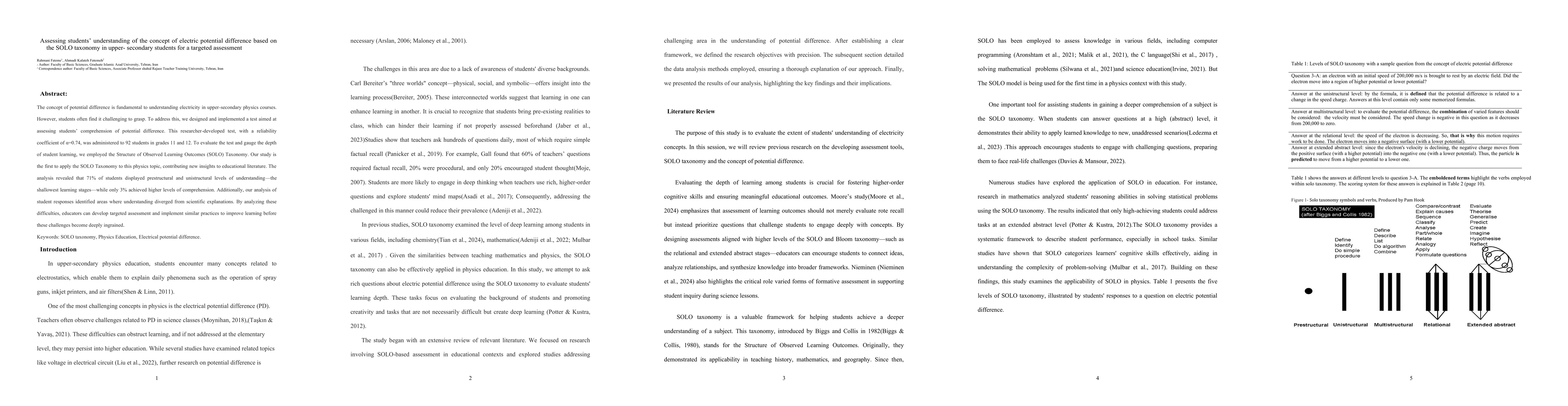 The concept of potential difference is fundamental to understanding electricity in upper secondary physics courses. However, students often find it challenging to grasp. To address this, we designed and implemented a test aimed at assessing students comprehension of potential difference. This researcher developed test, with a reliability coefficient of 0.74, was administered to 92 students in grades 11 and 12. To evaluate the test and gauge the depth of student learning, we employed the Structure of Observed Learning Outcomes SOLO Taxonomy. Our study is the first to apply the SOLO Taxonomy to this physics topic, contributing new insights to educational literature. The analysis revealed that 71% of students displayed prestructural and unistructural levels of understanding which is the shallowest learning stage while only 3% achieved higher levels of comprehension. Additionally, our analysis of student responses identified areas where understanding diverged from scientific explanations. By analyzing these difficulties, educators can develop targeted assessments and implement similar practices to improve learning before these challenges become deeply ingrained.