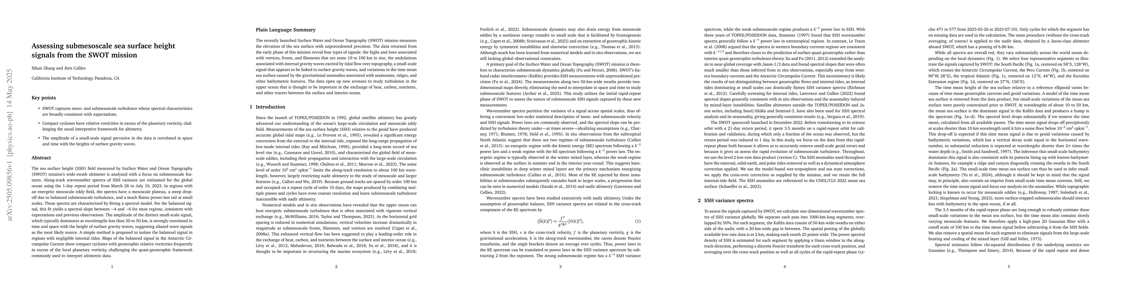 The paper presents a novel spectral analysis method for SSH data from the SWOT mission, enabling the identification and isolation of balanced and submesoscale turbulent signals.
