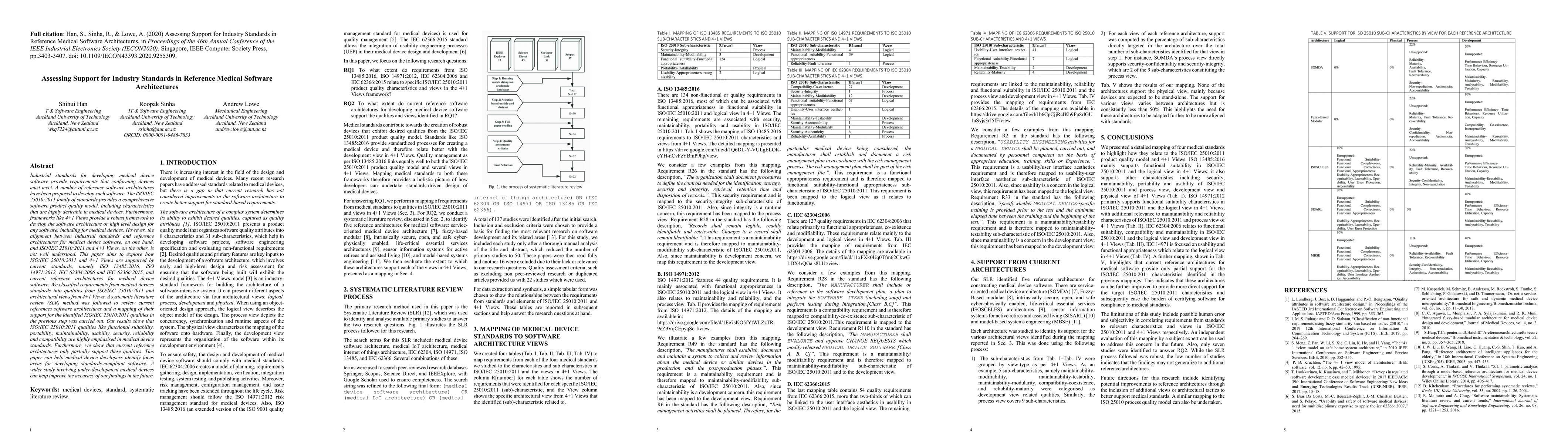 Industrial standards for developing medical device software provide requirements that conforming devices must meet. A number of reference software architectures have been proposed to develop such software. The ISO/IEC 25010:2011 family of standards provides a comprehensive software product quality model, including characteristics that are highly desirable in medical devices. Furthermore, frameworks like 4+1 Views provide a robust framework to develop the software architecture or high level design for any software, including for medical devices. However, the alignment between industrial standards and reference architectures for medical device software, on one hand, and ISO/IEC 25010:2011 and 4+1 Views, on the other, is not well understood. This paper aims to explore how ISO/IEC 25010:2011 and 4+1 Views are supported by current standards, namely ISO 13485:2016, ISO 14971:2012, IEC 62304:2006 and IEC 62366:2015, and current reference architectures for medical device software. We classified requirements from medical devices standards into qualities from ISO/IEC 25010:2011 and architectural views from 4+1 Views. A systematic literature review (SLR) method was followed to review current references software architectures and a mapping of their support for the identified ISO/IEC 25010:2011 qualities in the previous step was carried out. Our results show that ISO/IEC 25010:2011 qualities like functional suitability, portability, maintainability, usability, security, reliability and compatibility are highly emphasised in medical device standards. Furthermore, we show that current reference architectures only partially support these qualities. This paper can help medical device developers identify focus areas for developing standards-compliant software. A wider study involving under-development medical devices can help improve the accuracy of our findings in the future.
