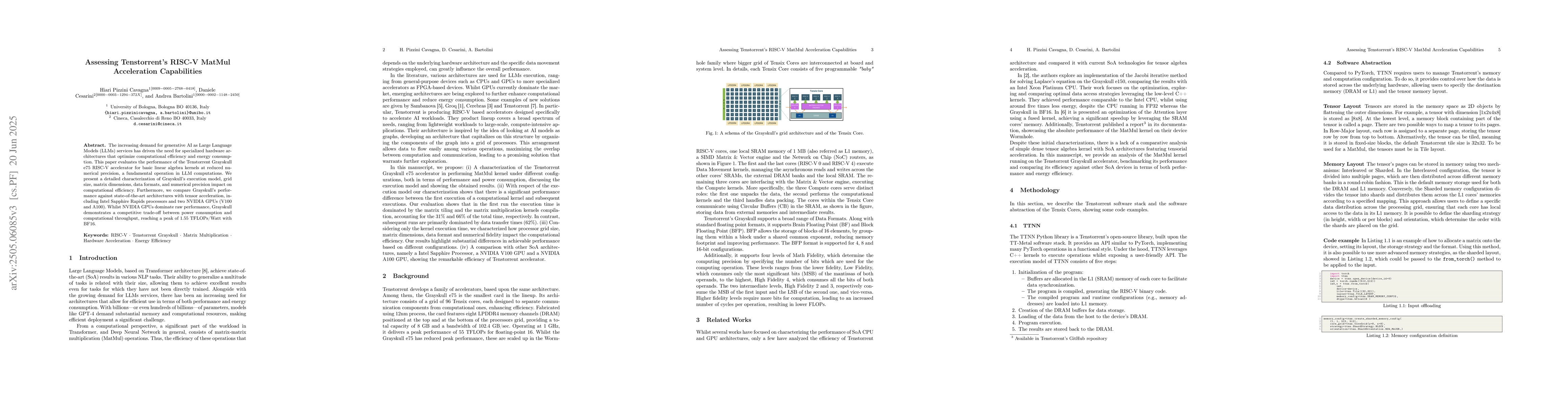 The paper evaluates Tenstorrent's Grayskull e75 RISC-V accelerator's performance for matrix multiplication (MatMul) operations at reduced precision, comparing it with Intel Sapphire Rapids, and NVIDIA V100 and A100 GPUs.