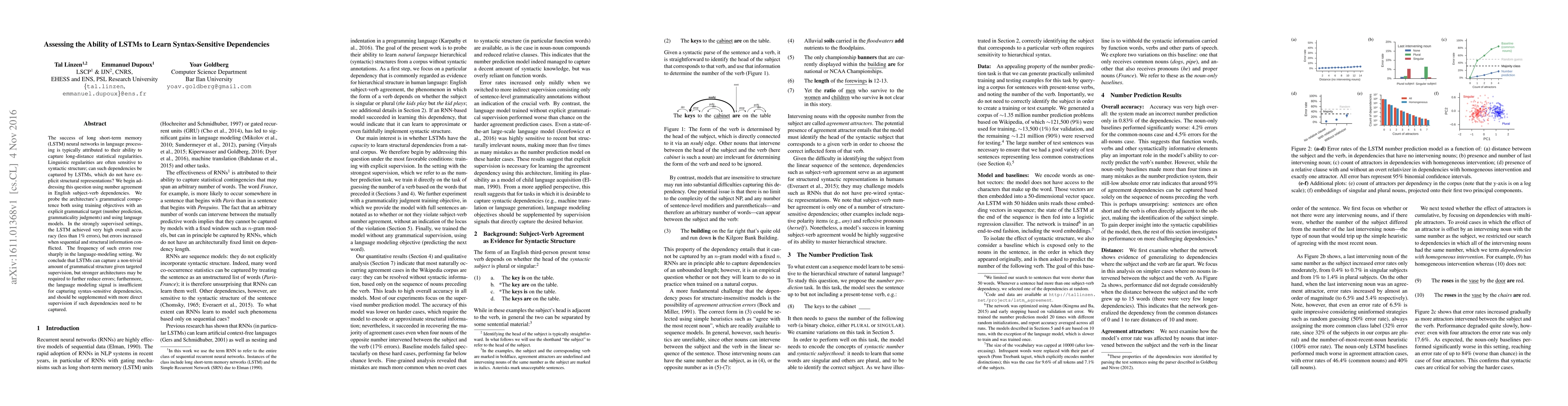 This paper investigates whether LSTMs can learn syntax-sensitive dependencies, using number agreement in English as a test case. While LSTMs achieve high accuracy under strong supervision, errors increase when syntax conflicts with sequence, indicating a need for stronger architectures to fully capture grammatical structure.