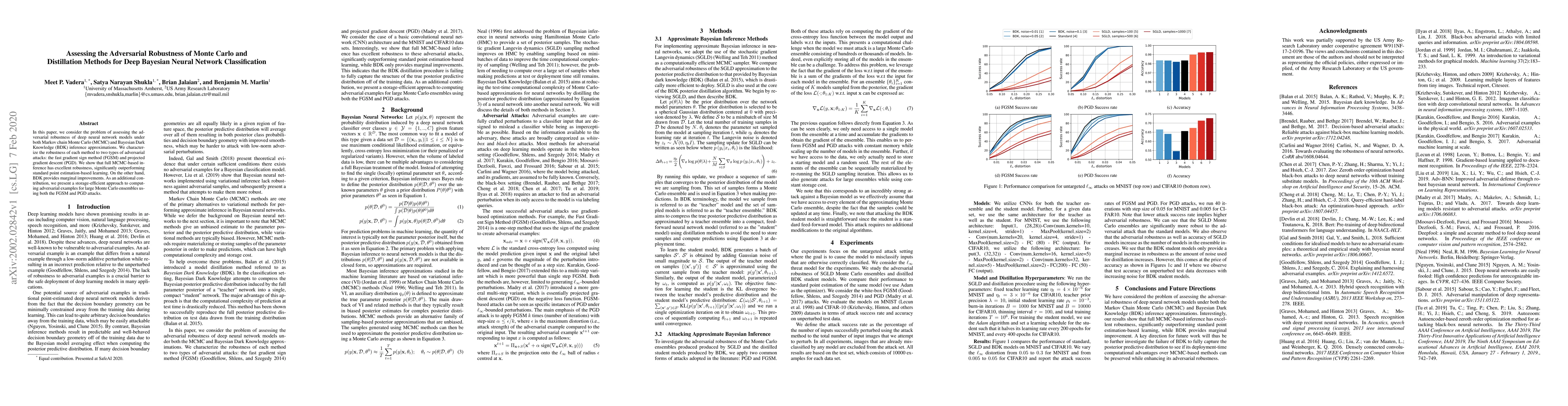 In this paper, we consider the problem of assessing the adversarial robustness of deep neural network models under both Markov chain Monte Carlo (MCMC) and Bayesian Dark Knowledge (BDK) inference approximations. We characterize the robustness of each method to two types of adversarial attacks: the fast gradient sign method (FGSM) and projected gradient descent (PGD). We show that full MCMC-based inference has excellent robustness, significantly outperforming standard point estimation-based learning. On the other hand, BDK provides marginal improvements. As an additional contribution, we present a storage-efficient approach to computing adversarial examples for large Monte Carlo ensembles using both the FGSM and PGD attacks.