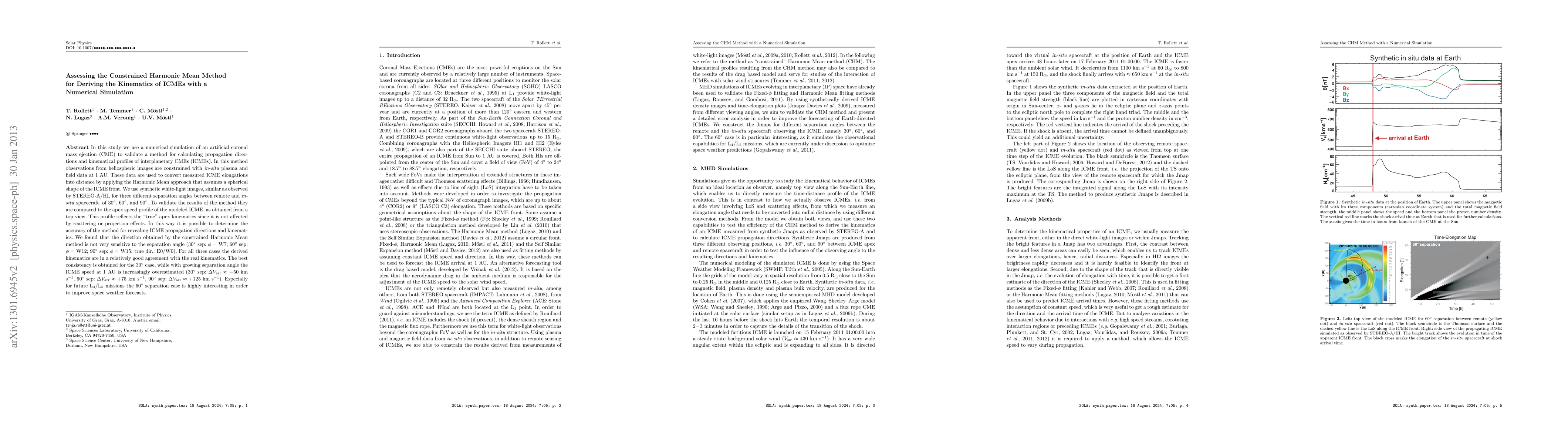 In this study we use a numerical simulation of an artificial coronal mass ejection (CME) to validate a method for calculating propagation directions and kinematical profiles of interplanetary CMEs (ICMEs). In this method observations from heliospheric images are constrained with in-situ plasma and field data at 1 AU. These data are used to convert measured ICME elongations into distance by applying the Harmonic Mean approach that assumes a spherical shape of the ICME front. We use synthetic white-light images, similar as observed by STEREO-A/HI, for three different separation angles between remote and in-situ spacecraft, of 30{\deg}, 60{\deg}, and 90{\deg}. To validate the results of the method they are compared to the apex speed profile of the modeled ICME, as obtained from a top view. This profile reflects the "true" apex kinematics since it is not affected by scattering or projection effects. In this way it is possible to determine the accuracy of the method for revealing ICME propagation directions and kinematics. We found that the direction obtained by the constrained Harmonic Mean method is not very sensitive to the separation angle (30{\deg} sep: \phi = W7; 60{\deg} sep: \phi = W12; 90{\deg} sep: \phi = W15; true dir.: E0/W0). For all three cases the derived kinematics are in a relatively good agreement with the real kinematics. The best consistency is obtained for the 30{\deg} case, while with growing separation angle the ICME speed at 1 AU is increasingly overestimated (30{\deg} sep: \Delta V_arr ~-50 km/s, 60{\deg} sep: \Delta V_arr ~+75 km/s, 90{\deg} sep: \Delta V_arr ~+125 km/s). Especially for future L4/L5 missions the 60{\deg} separation case is highly interesting in order to improve space weather forecasts.