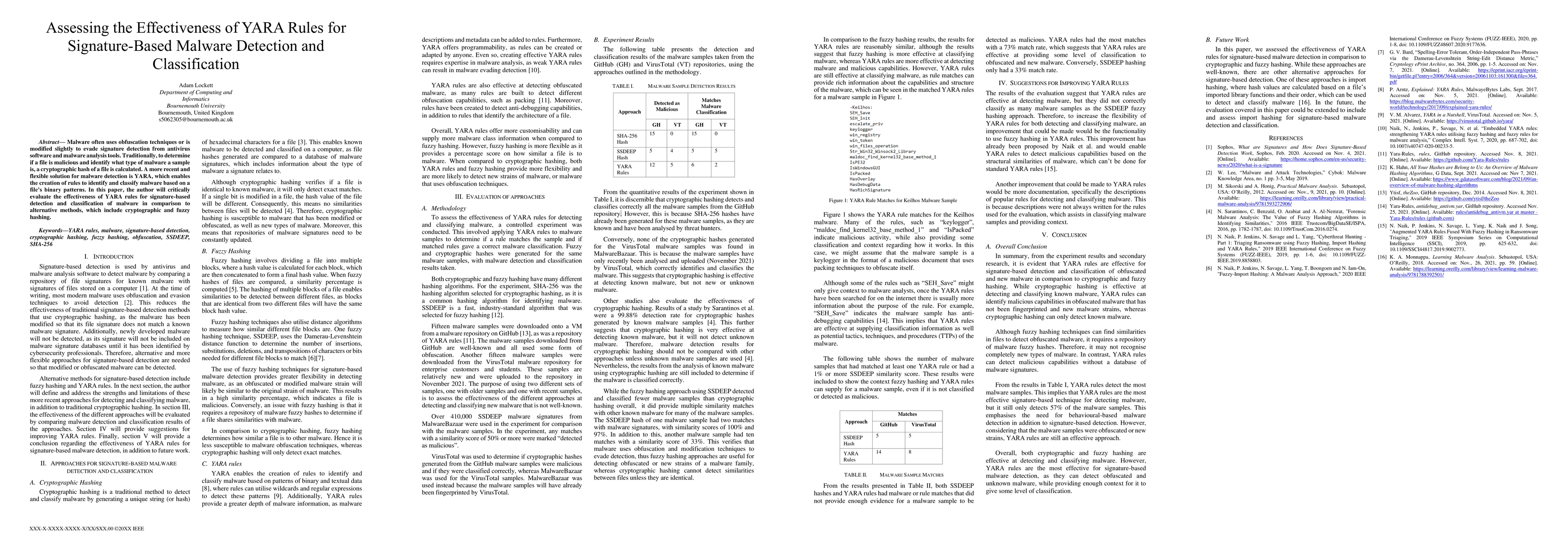This work contributes to the field by assessing the effectiveness of YARA rules for signature-based malware detection, providing a novel approach to improving malware detection and classification.