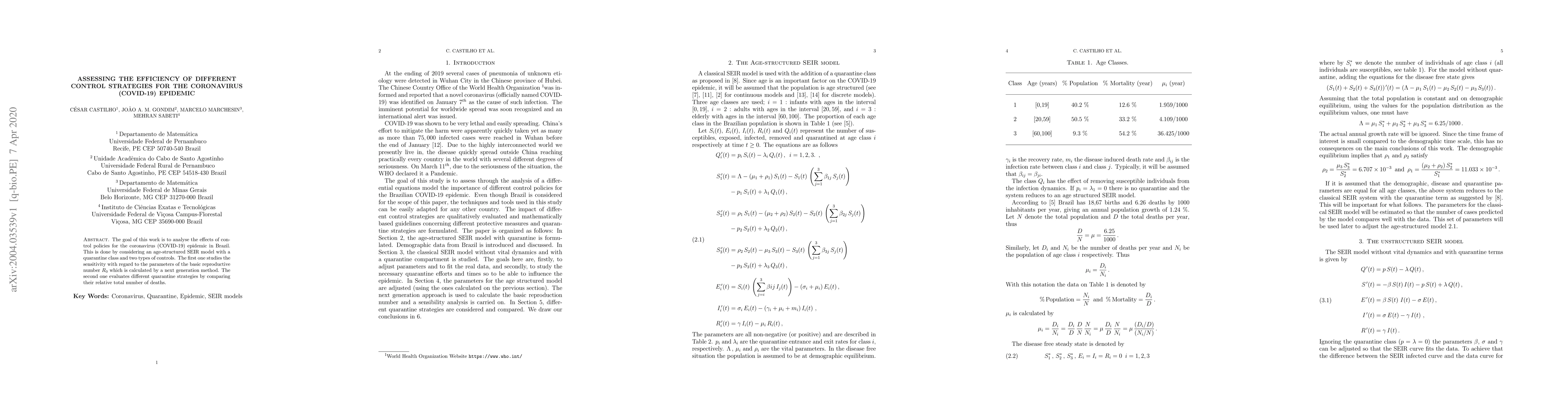 This study evaluates the effectiveness of various control strategies for the COVID-19 epidemic in Brazil using an age-structured SEIR model, focusing on the sensitivity of the basic reproductive number R0 and the comparative impact of different quarantine approaches on total deaths.