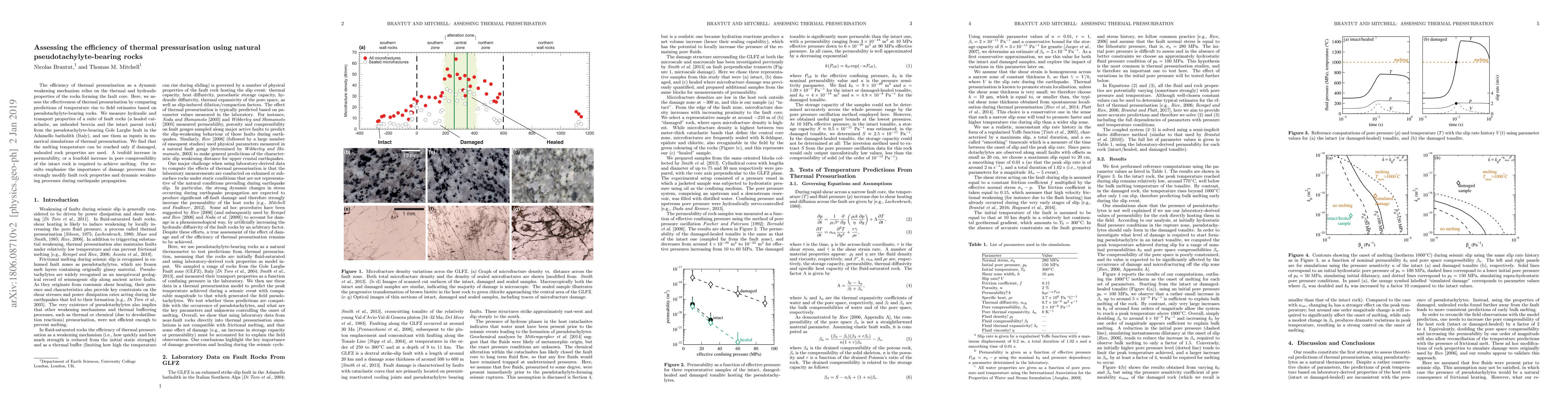 The efficiency of thermal pressurisation as a dynamic weakening mechanism relies on the thermal and hydraulic properties of the rocks forming the fault core. Here, we assess the effectiveness of thermal pressurisation by comparing predictions of temperature rise to field estimates based on pseudotachylyte-bearing rocks. We measure hydraulic and transport properties of a suite of fault rocks (a healed cataclasite, an unhealed breccia and the intact parent rock) from the pseudotachylyte-bearing Gole Larghe fault in the Adamello batholith (Italy), and use them as inputs in numerical simulations of thermal pressurisation. We find that the melting temperature can be reached only if damaged, unhealed rock properties are used. A tenfold increase in permeability, or a fourfold increase in pore compressibility of the intact rock is required to achieve melting. Our results emphasise the importance of damage processes that strongly modify fault rock properties and dynamic weakening processes during earthquake propagation.