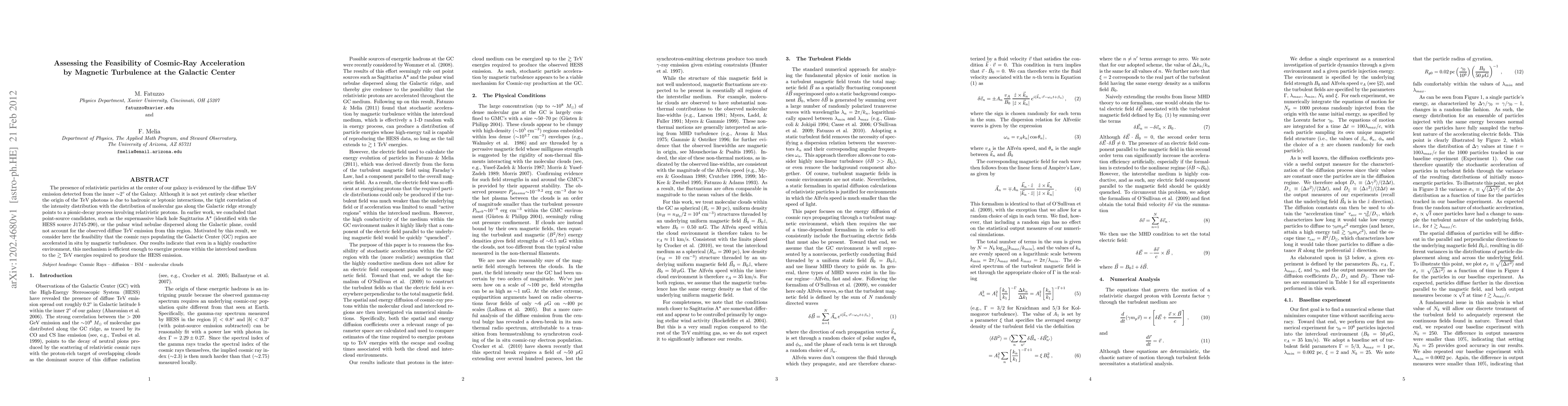 The presence of relativistic particles at the center of our galaxy is evidenced by the diffuse TeV emission detected from the inner $\sim$$2^\circ$ of the Galaxy. Although it is not yet entirely clear whether the origin of the TeV photons is due to hadronic or leptonic interactions, the tight correlation of the intensity distribution with the distribution of molecular gas along the Galactic ridge strongly points to a pionic-decay process involving relativistic protons. In earlier work, we concluded that point-source candidates, such as the supermassive black hole Sagittarius A* (identified with the HESS source J1745-290), or the pulsar wind nebulae dispersed along the Galactic plane, could not account for the observed diffuse TeV emission from this region. Motivated by this result, we consider here the feasibility that the cosmic rays populating the Galactic Center (GC) region are accelerated in situ by magnetic turbulence. Our results indicate that even in a highly conductive environment, this mechanism is efficient enough to energize protons within the intercloud medium to the $\ga $ TeV energies required to produce the HESS emission.