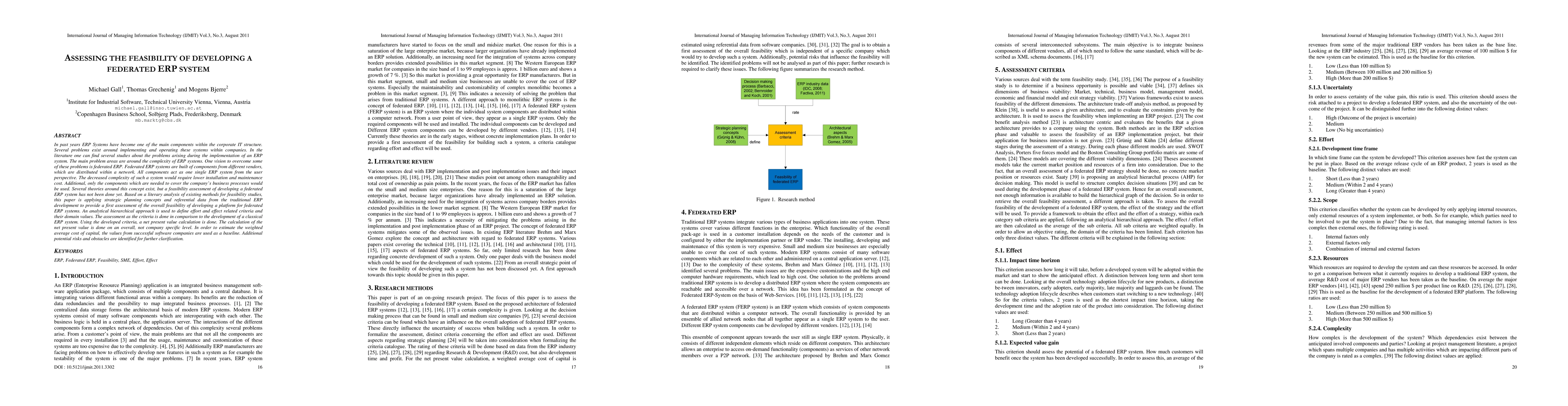 This paper assesses the feasibility of developing a federated ERP system, which combines components from different vendors into a cohesive network. Using an analytical hierarchical approach and strategic planning concepts, the study compares the effort and effect criteria of a federated ERP system against traditional ERP systems, evaluating costs, risks, and potential benefits.