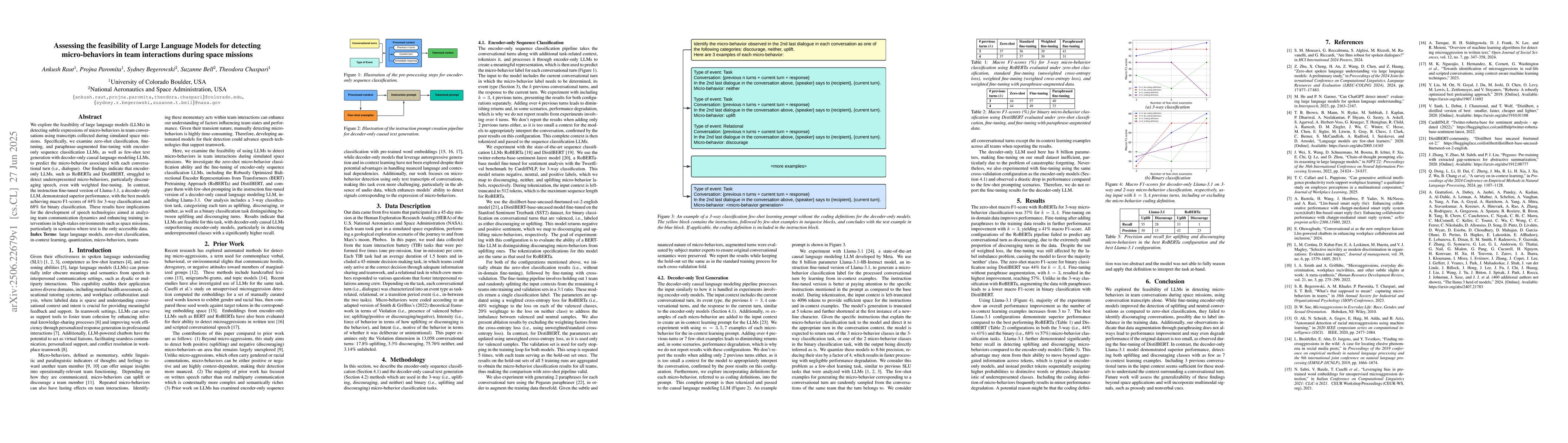 We explore the feasibility of large language models (LLMs) in detecting subtle expressions of micro-behaviors in team conversations using transcripts collected during simulated space missions. Specifically, we examine zero-shot classification, fine-tuning, and paraphrase-augmented fine-tuning with encoder-only sequence classification LLMs, as well as few-shot text generation with decoder-only causal language modeling LLMs, to predict the micro-behavior associated with each conversational turn (i.e., dialogue). Our findings indicate that encoder-only LLMs, such as RoBERTa and DistilBERT, struggled to detect underrepresented micro-behaviors, particularly discouraging speech, even with weighted fine-tuning. In contrast, the instruction fine-tuned version of Llama-3.1, a decoder-only LLM, demonstrated superior performance, with the best models achieving macro F1-scores of 44% for 3-way classification and 68% for binary classification. These results have implications for the development of speech technologies aimed at analyzing team communication dynamics and enhancing training interventions in high-stakes environments such as space missions, particularly in scenarios where text is the only accessible data.