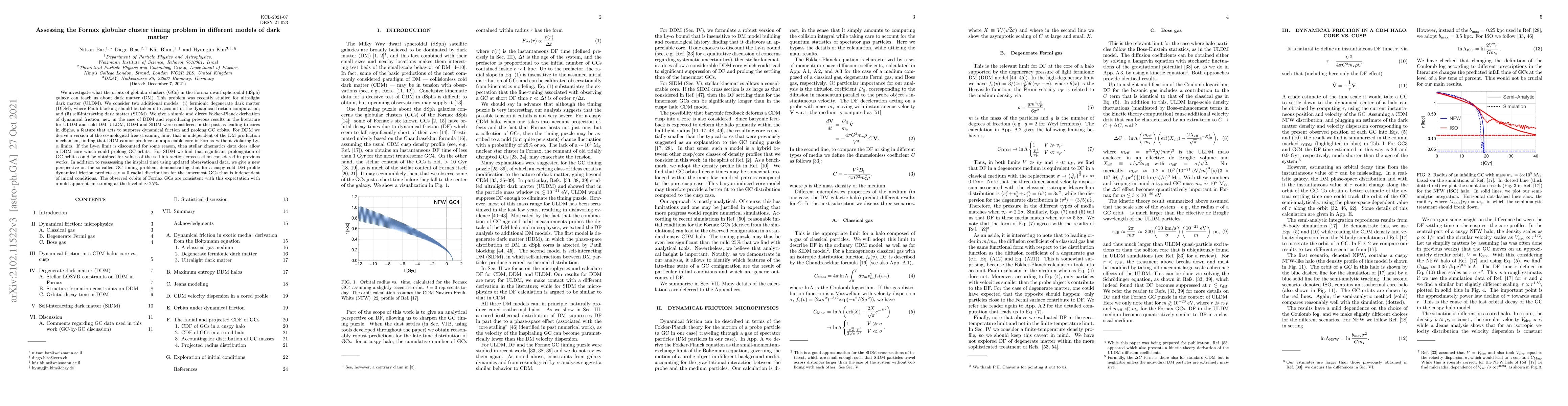 We investigate what the orbits of globular clusters (GCs) in the Fornax dwarf spheroidal (dSph) galaxy can teach us about dark matter (DM). This problem was recently studied for ultralight dark matter (ULDM). We consider two additional models: (i) fermionic degenerate dark matter (DDM), where Pauli blocking should be taken into account in the dynamical friction computation; and (ii) self-interacting dark matter (SIDM). We give a simple and direct Fokker-Planck derivation of dynamical friction, new in the case of DDM and reproducing previous results in the literature for ULDM and cold DM. ULDM, DDM and SIDM were considered in the past as leading to cores in dSphs, a feature that acts to suppress dynamical friction and prolong GC orbits. For DDM we derive a version of the cosmological free streaming limit that is independent of the DM production mechanism, finding that DDM cannot produce an appreciable core in Fornax without violating Ly-$\alpha$ limits. If the Ly-$\alpha$ limit is discounted for some reason, then stellar kinematics data does allow a DDM core which could prolong GC orbits. For SIDM we find that significant prolongation of GC orbits could be obtained for values of the self-interaction cross section considered in previous works. In addition to reassessing the inspiral time using updated observational data, we give a new perspective on the so-called GC timing problem, demonstrating that for a cuspy cold DM profile dynamical friction predicts a $z=0$ radial distribution for the innermost GCs that is independent of initial conditions. The observed orbits of Fornax GCs are consistent with this expectation with a mild apparent fine-tuning at the level of $\sim25\%$.