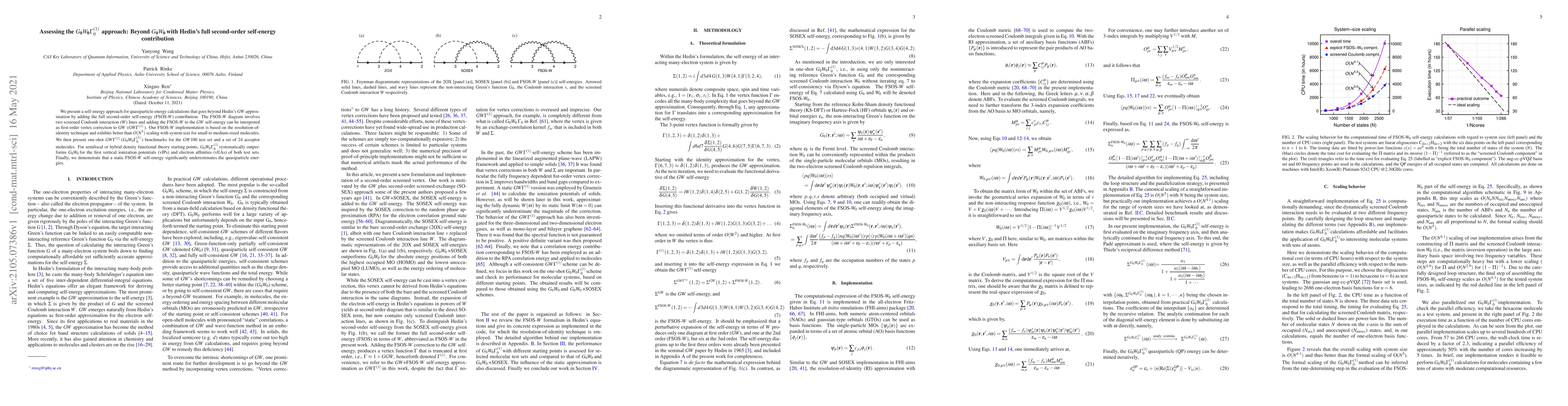 We present and benchmark a self-energy approach for quasiparticle energy calculations that goes beyond Hedin's $GW$ approximation by adding the full second-order self-energy (FSOS-$W$) contribution. The FSOS-$W$ diagram involves two screened Coulomb interaction ($W$) lines and adding the FSOS-$W$ to the $GW$ self-energy can be interpreted as first-order vertex correction to $GW$ ($GW\Gamma^{(1)}$). Our FSOS-$W$ implementation is based on the resolution-of-identity technique and exhibits better than $O(N^5)$ scaling with system size for small to medium-sized molecules. We then present one-shot $GW\Gamma^{(1)}$ ($G_0W_0\Gamma^{(1)}_0$) benchmarks for the $GW$100 test set and a set of 24 acceptor molecules. For semilocal or hybrid density functional theory starting points, $G_0W_0\Gamma^{(1)}_0$ systematically outperforms $G_0W_0$ for the first vertical ionization potentials (vIPs) and electron affinities (vEAs) of both test sets. Finally, we demonstrate that a static FSOS-$W$ self-energy significantly underestimates the quasiparticle energies.