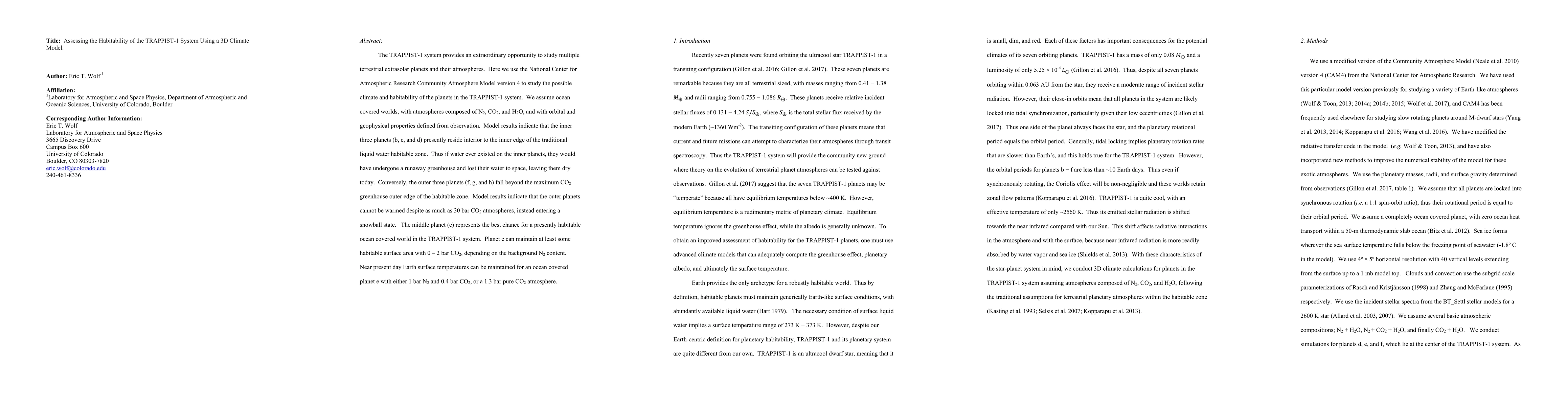 This study uses a 3D climate model to assess the habitability of planets in the TRAPPIST-1 system, finding that the inner three planets are too hot and the outer three too cold to sustain liquid water, while the middle planet (e) shows the best potential for habitability under certain atmospheric conditions.