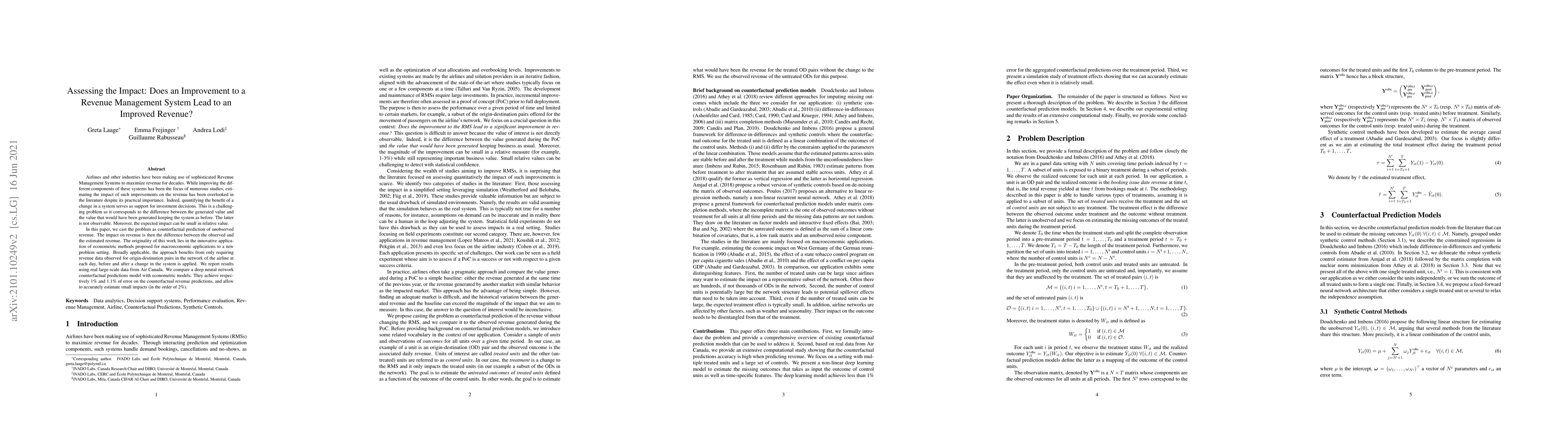 Airlines and other industries have been making use of sophisticated Revenue Management Systems to maximize revenue for decades. While improving the different components of these systems has been the focus of numerous studies, estimating the impact of such improvements on the revenue has been overlooked in the literature despite its practical importance. Indeed, quantifying the benefit of a change in a system serves as support for investment decisions. This is a challenging problem as it corresponds to the difference between the generated value and the value that would have been generated keeping the system as before. The latter is not observable. Moreover, the expected impact can be small in relative value. In this paper, we cast the problem as counterfactual prediction of unobserved revenue. The impact on revenue is then the difference between the observed and the estimated revenue. The originality of this work lies in the innovative application of econometric methods proposed for macroeconomic applications to a new problem setting. Broadly applicable, the approach benefits from only requiring revenue data observed for origin-destination pairs in the network of the airline at each day, before and after a change in the system is applied. We report results using real large-scale data from Air Canada. We compare a deep neural network counterfactual predictions model with econometric models. They achieve respectively 1% and 1.1% of error on the counterfactual revenue predictions, and allow to accurately estimate small impacts (in the order of 2%).