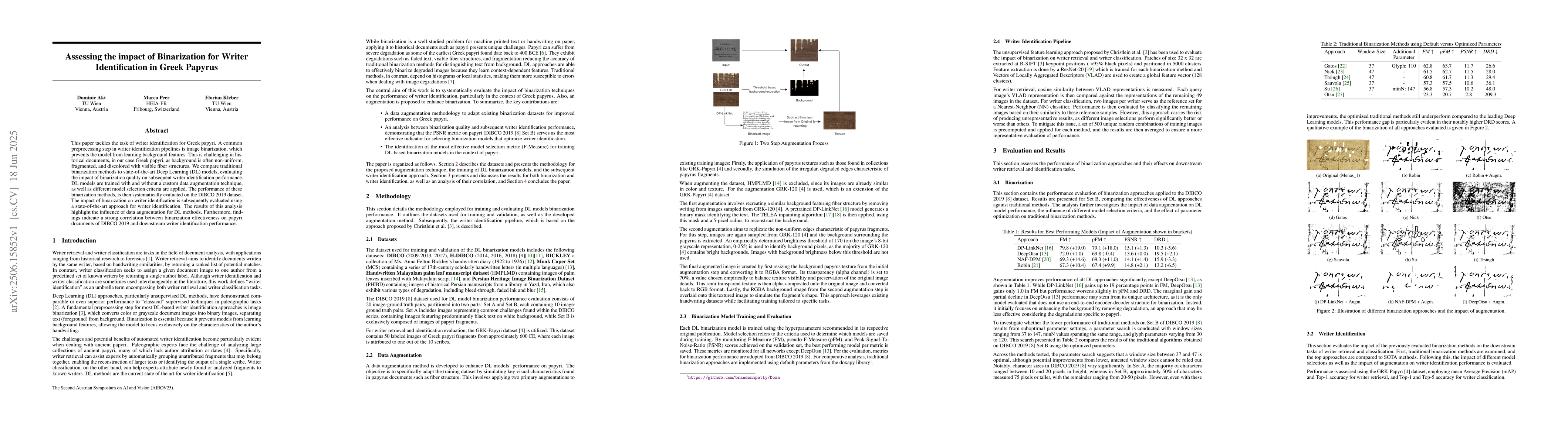 This paper tackles the task of writer identification for Greek papyri. A common preprocessing step in writer identification pipelines is image binarization, which prevents the model from learning background features. This is challenging in historical documents, in our case Greek papyri, as background is often non-uniform, fragmented, and discolored with visible fiber structures. We compare traditional binarization methods to state-of-the-art Deep Learning (DL) models, evaluating the impact of binarization quality on subsequent writer identification performance. DL models are trained with and without a custom data augmentation technique, as well as different model selection criteria are applied. The performance of these binarization methods, is then systematically evaluated on the DIBCO 2019 dataset. The impact of binarization on writer identification is subsequently evaluated using a state-of-the-art approach for writer identification. The results of this analysis highlight the influence of data augmentation for DL methods. Furthermore, findings indicate a strong correlation between binarization effectiveness on papyri documents of DIBCO 2019 and downstream writer identification performance.