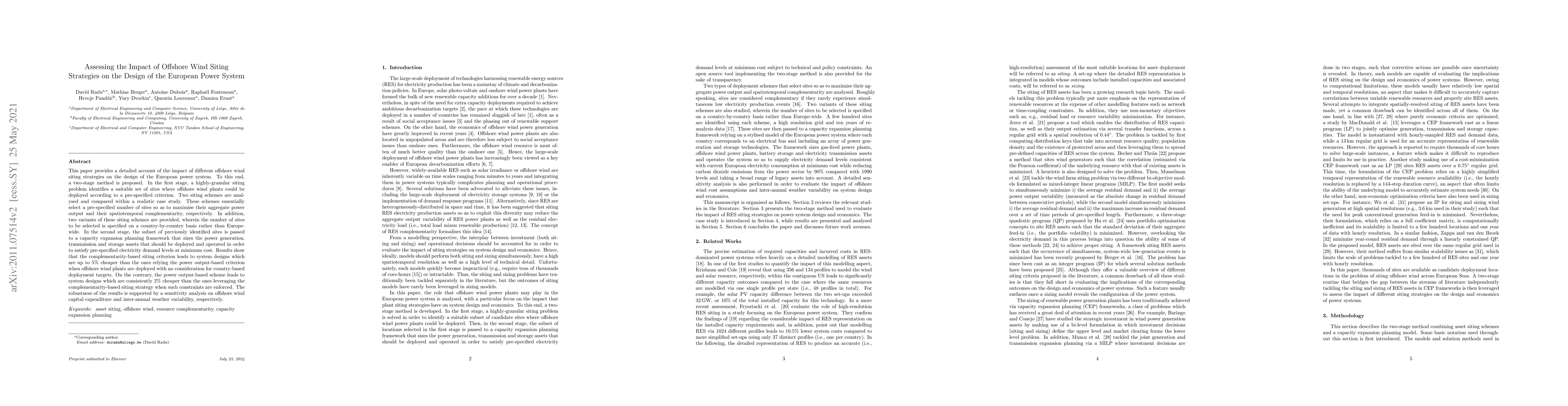 This paper evaluates the impact of different offshore wind siting strategies on the European power system design, employing a two-stage method. It finds that complementarity-based siting can be up to 5% cheaper than power output-based siting, but the latter is more cost-effective when country-specific deployment targets are considered.