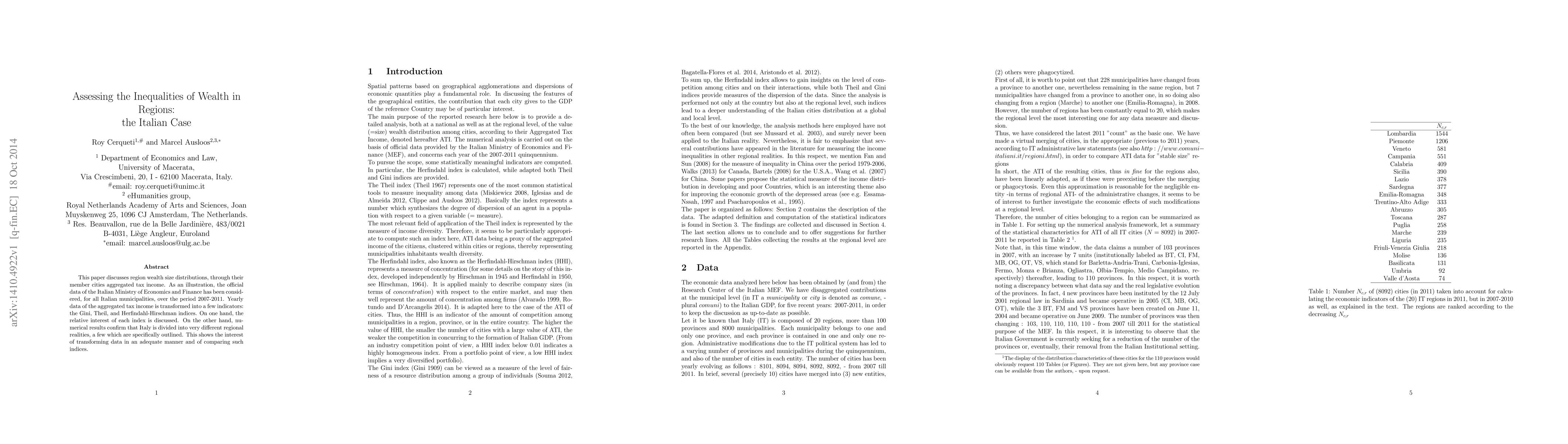 This paper discusses region wealth size distributions, through their member cities aggregated tax income. As an illustration, the official data of the Italian Ministry of Economics and Finance has been considered, for all Italian municipalities, over the period 2007-2011. Yearly data of the aggregated tax income is transformed into a few indicators: the Gini, Theil, and Herfindahl-Hirschman indices. On one hand, the relative interest of each index is discussed. On the other hand, numerical results confirm that Italy is divided into very different regional realities, a few which are specifically outlined. This shows the interest of transforming data in an adequate manner and of comparing such indices.