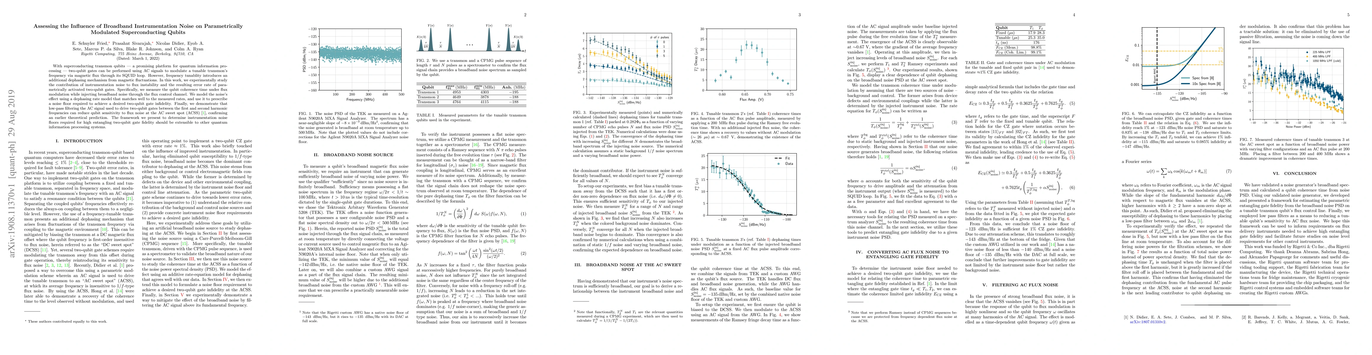 This paper investigates the impact of broadband instrumentation noise on the performance of parametrically modulated superconducting qubits, finding that low-pass filtering the AC signal can mitigate qubit sensitivity to flux noise, thereby enhancing two-qubit gate fidelity. The study models the noise's effect and proposes a framework for determining noise floors necessary for high fidelity quantum gates.