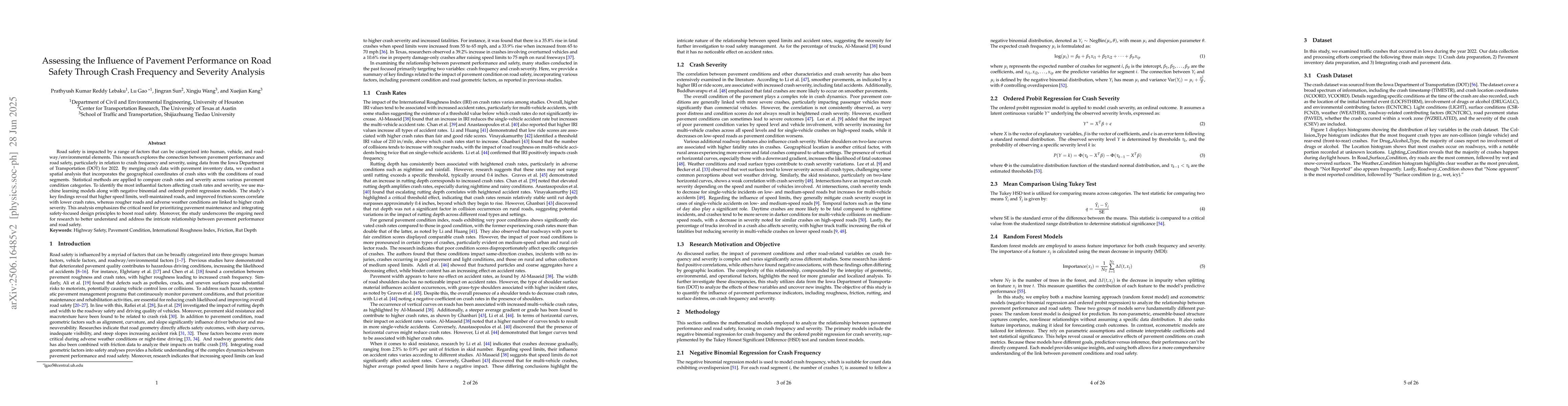 Road safety is impacted by a range of factors that can be categorized into human, vehicle, and roadway/environmental elements. This research explores the connection between pavement performance and road safety, particularly in relation to crash frequency and severity, using data from the Iowa Department of Transportation (DOT) for 2022. By merging crash data with pavement inventory data, we conduct a spatial analysis that incorporates the geographical coordinates of crash sites with the conditions of road segments. Statistical methods are applied to compare crash rates and severity across various pavement condition categories. To identify the most influential factors affecting crash rates and severity, we use machine learning models along with negative binomial and ordered probit regression models. The study's key findings reveal that higher speed limits, well-maintained roads, and improved friction scores correlate with lower crash rates, whereas rougher roads and adverse weather conditions are linked to higher crash severity. This analysis emphasizes the critical need for prioritizing pavement maintenance and integrating safety-focused design principles to boost road safety. Moreover, the study underscores the ongoing need for research to better understand and address the intricate relationship between pavement performance and road safety.