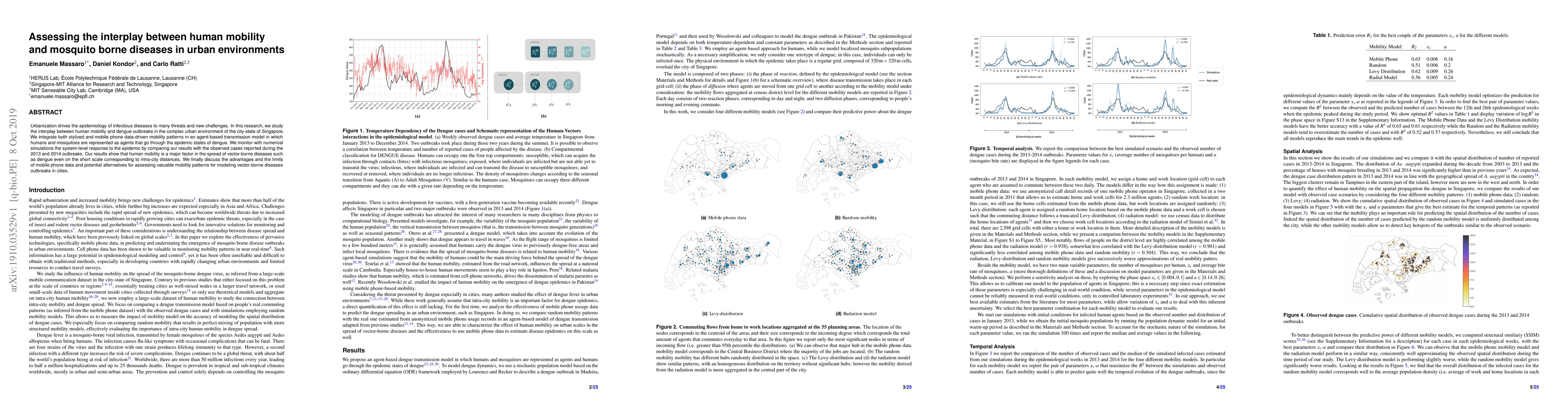 Urbanization drives the epidemiology of infectious diseases to many threats and new challenges. In this research, we study the interplay between human mobility and dengue outbreaks in the complex urban environment of the city-state of Singapore. We integrate both stylized and mobile phone data-driven mobility patterns in an agent-based transmission model in which humans and mosquitoes are represented as agents that go through the epidemic states of dengue. We monitor with numerical simulations the system-level response to the epidemic by comparing our results with the observed cases reported during the 2013 and 2014 outbreaks. Our results show that human mobility is a major factor in the spread of vector-borne diseases such as dengue even on the short scale corresponding to intra-city distances. We finally discuss the advantages and the limits of mobile phone data and potential alternatives for assessing valuable mobility patterns for modeling vector-borne diseases outbreaks in cities.