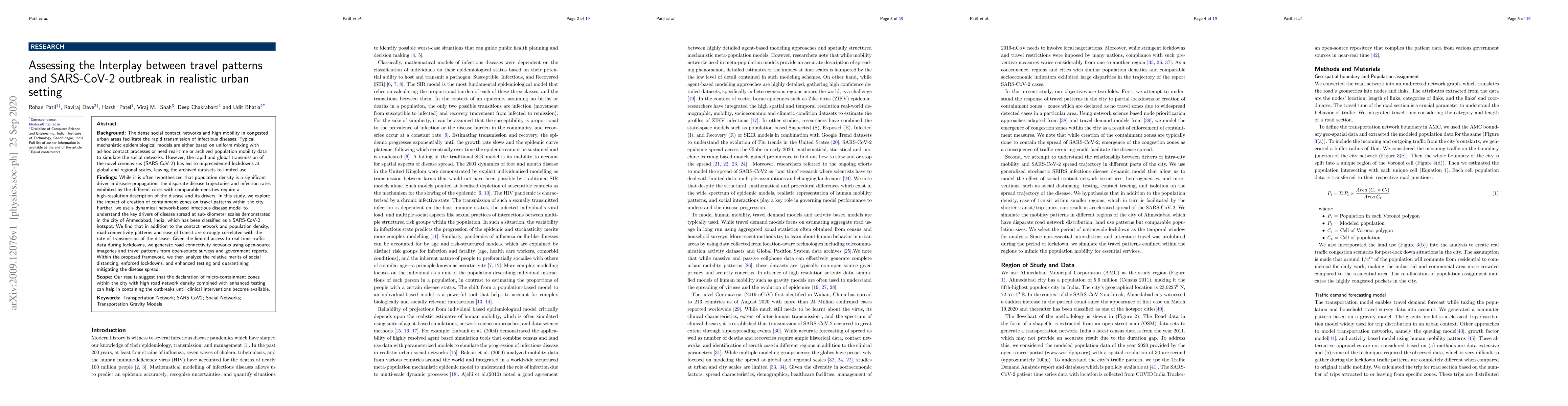 This study investigates how travel patterns and urban road connectivity influence SARS-CoV-2 transmission in Ahmedabad, India, using a network-based model. It finds that factors like road connectivity and ease of transit significantly affect disease spread, alongside population density and contact networks.