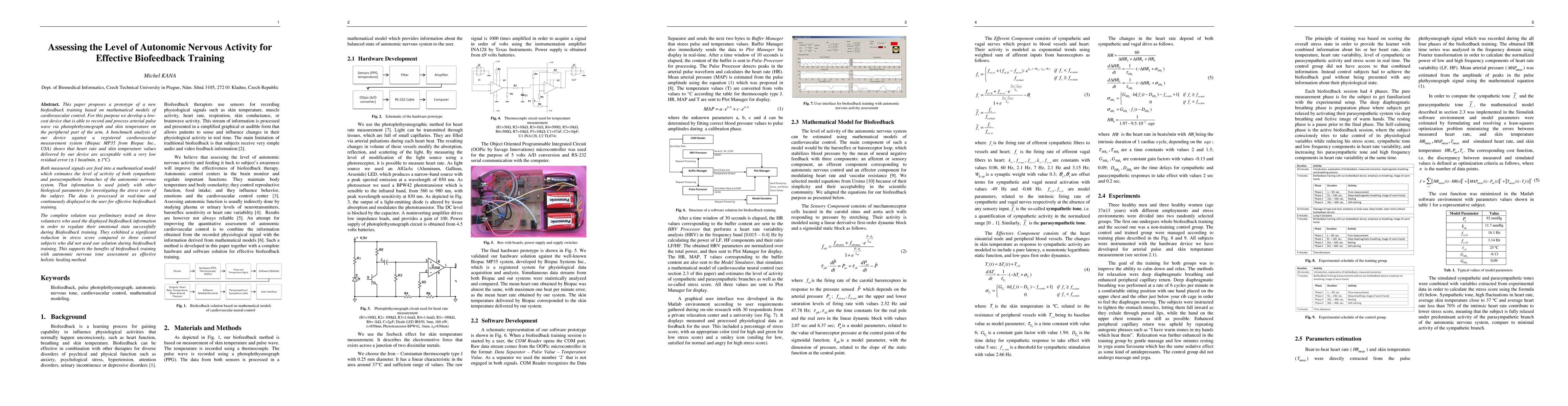 This paper proposes a prototype of a new biofeedback training based on mathematical models of cardiovascular control. For this purpose we develop a low-cost device that is able to record and process arterial pulse wave via photoplethysmograph and skin temperature on the peripheral part of the arm. A benchmark analysis of our device against a registered cardiovascular measurement system (Biopac MP35 from Biopac Inc., USA) shows that heart rate and skin temperature values delivered by our device are acceptable with a very low residual error (+/-1 beat/min, +/-1 oC). Both measured signals are feed into a mathematical model which estimates the level of activity of both sympathetic and parasympathetic branches of the autonomic nervous system. That information is used jointly with other biological parameters for investigating the stress score of the subject. The data is processed in real-time and continuously displayed to the user for effective biofeedback training. The complete solution was preliminary tested on three volunteers who used the displayed biofeedback information in order to regulate their emotional state successfully during Biofeedback training. They exhibited a significant reduction in stress score compared to three control subjects who did not used our solution during biofeedback training. This supports the benefits of biofeedback training with autonomic nervous tone assessment as effective holistic healing method.
