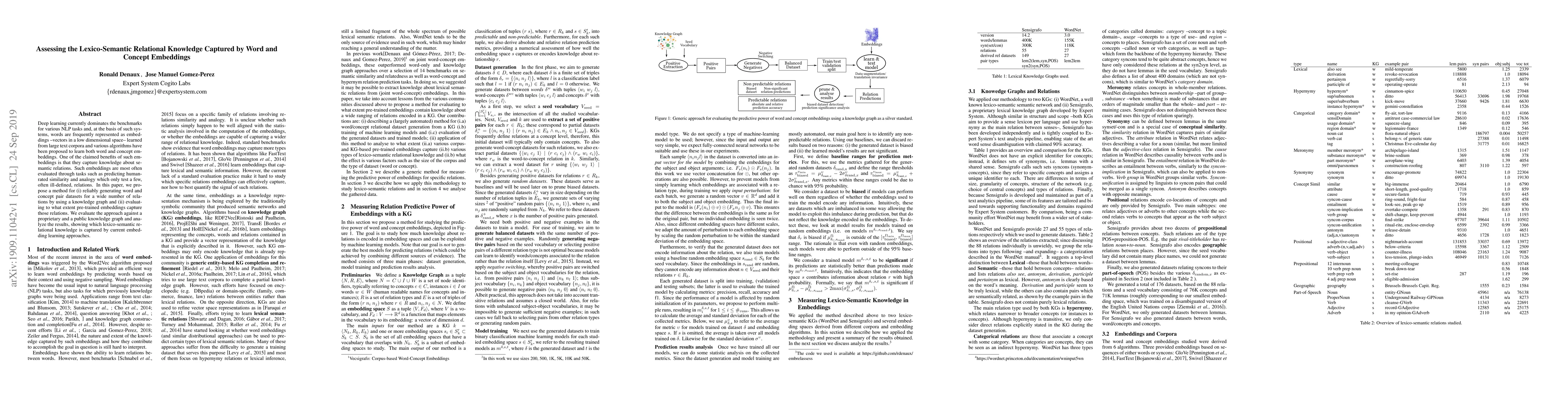 This paper proposes a method to generate datasets for a wide range of lexico-semantic relations using a knowledge graph and evaluates how well pre-trained word and concept embeddings capture these relations. The study analyzes the results to determine the extent of relational knowledge captured by current embedding learning approaches.