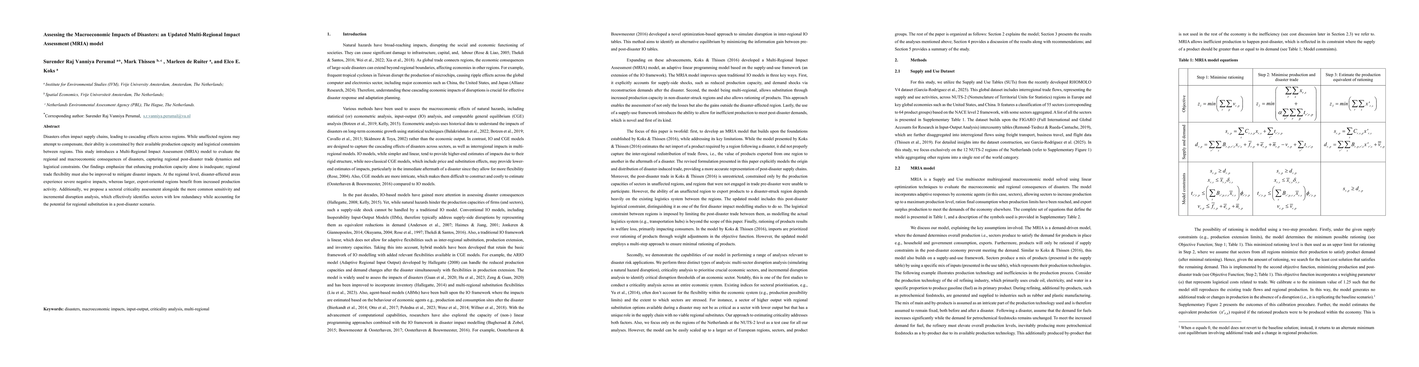 Disasters often impact supply chains, leading to cascading effects across regions. While unaffected regions may attempt to compensate, their ability is constrained by their available production capacity and logistical constraints between regions. This study introduces a Multi-Regional Impact Assessment (MRIA) model to evaluate the regional and macroeconomic consequences of disasters, capturing regional post-disaster trade dynamics and logistical constraints. Our findings emphasize that enhancing production capacity alone is inadequate; regional trade flexibility must also be improved to mitigate disaster impacts. At the regional level, disaster-affected areas experience severe negative impacts, whereas larger, export-oriented regions benefit from increased production activity. Additionally, we propose a sectoral criticality assessment alongside the more common sensitivity and incremental disruption analysis, which effectively identifies sectors with low redundancy while accounting for the potential for regional substitution in a post-disaster scenario.